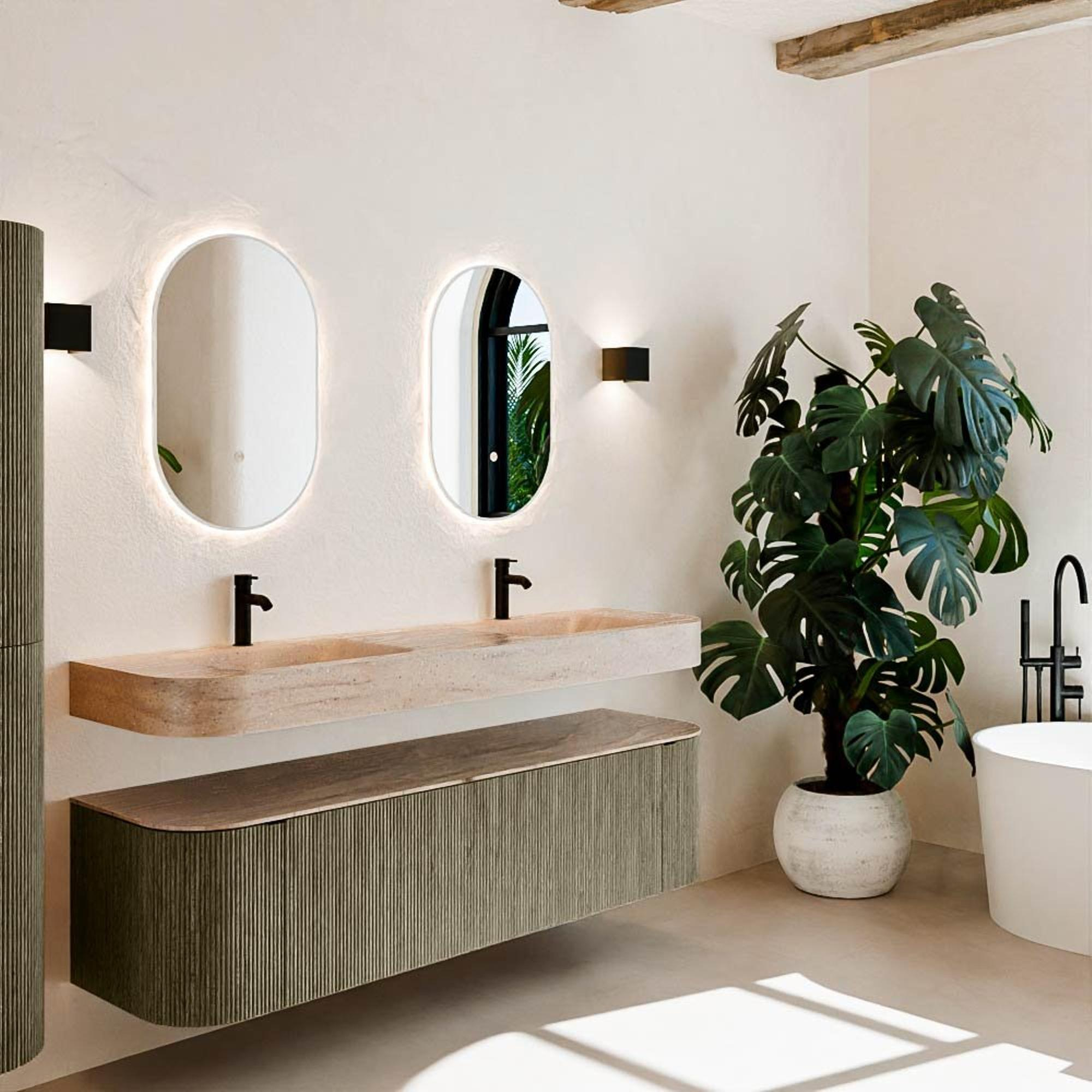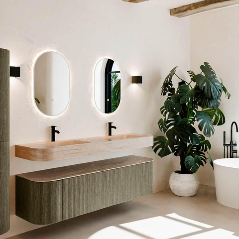 Natuurlijke materialen in warme tinten. De verticale ribbels brengen ritme en textuur in het ontwerp, terwijl het eikenhout zorgt voor een warme, ambachtelijke uitstraling. Kies uit 5 houttinten OAK, WALNUT, DUSK, SHADOW en RUBY zorgvuldig geselecteerde houtkleuren om zowel moderne als klassieke badkamers te verrijken.