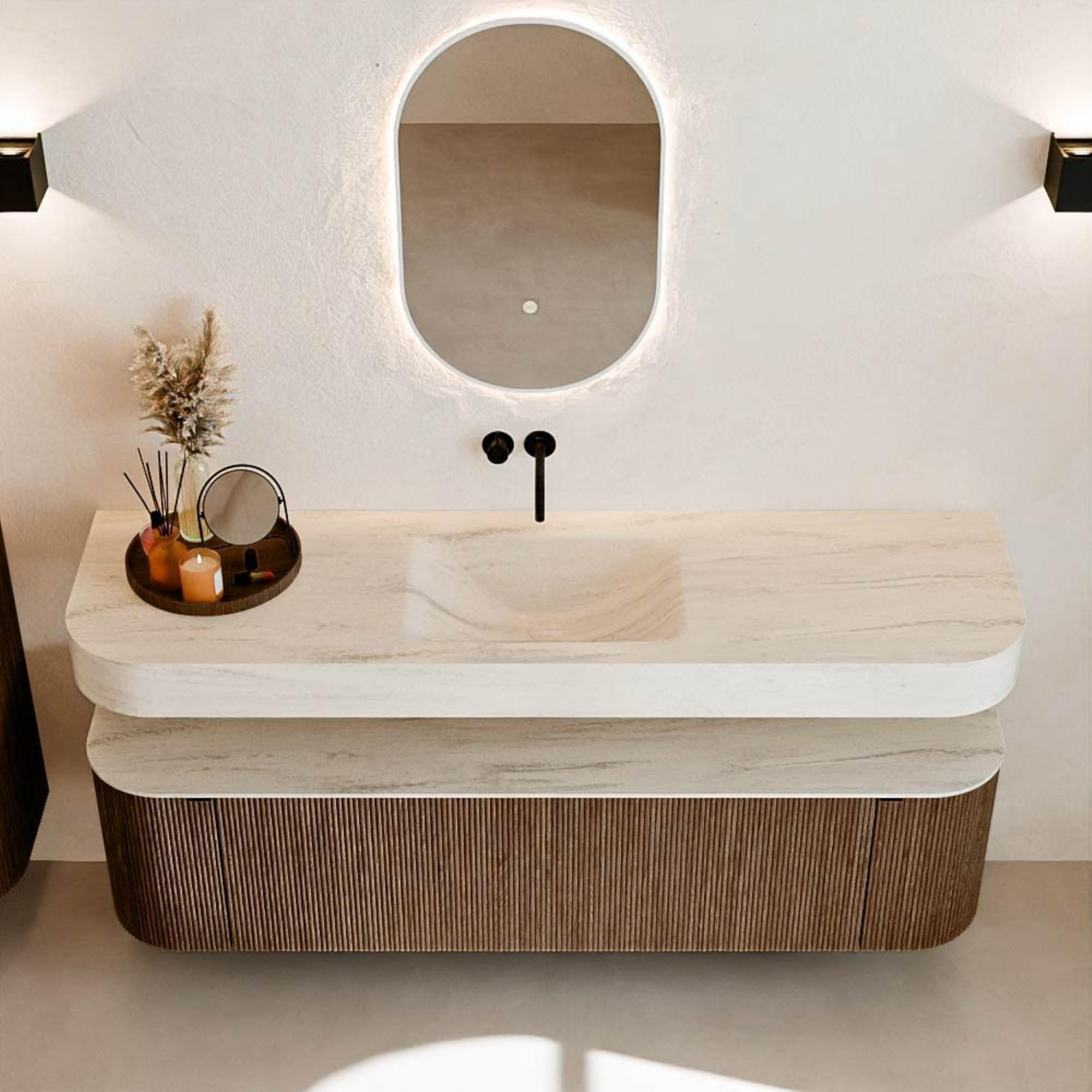 Natuurlijke materialen in warme tinten. De verticale ribbels brengen ritme en textuur in het ontwerp, terwijl het eikenhout zorgt voor een warme, ambachtelijke uitstraling. Kies uit 5 houttinten OAK, WALNUT, DUSK, SHADOW en RUBY zorgvuldig geselecteerde houtkleuren om zowel moderne als klassieke badkamers te verrijken.