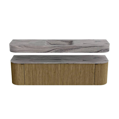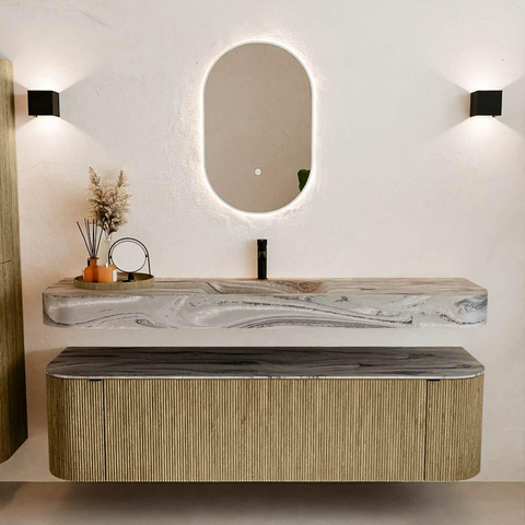 Boven het meubel zweeft een bijpassende, vrij hangende wastafel met afgeronde hoeken – perfect afgestemd op de vorm van de kast. De wastafel is uitgevoerd in Solid Surface en volgt subtiel de lijnen van het onderliggende meubel, waardoor een harmonieus geheel ontstaat. Het Solid Surface topblad vormt een sterke, onderhoudsvriendelijke basis en maakt de combinatie compleet.
