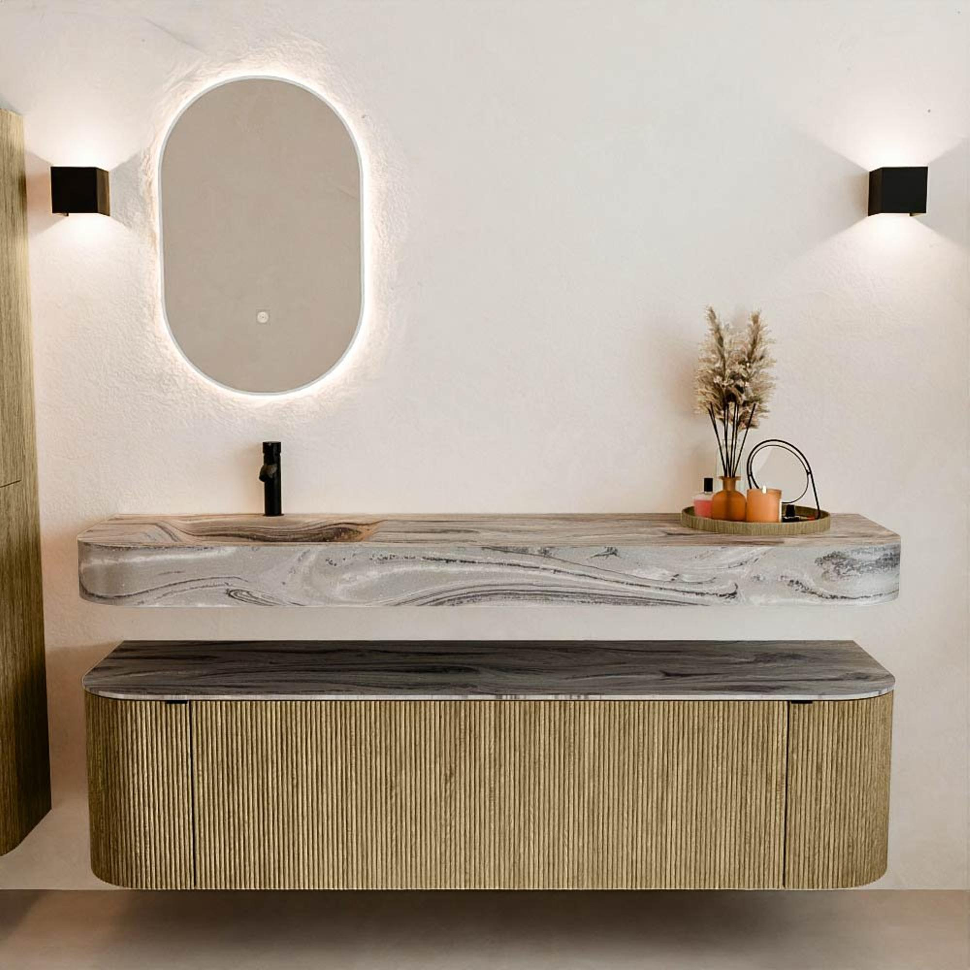 Natuurlijke materialen in warme tinten. De verticale ribbels brengen ritme en textuur in het ontwerp, terwijl het eikenhout zorgt voor een warme, ambachtelijke uitstraling. Kies uit 5 houttinten OAK, WALNUT, DUSK, SHADOW en RUBY zorgvuldig geselecteerde houtkleuren om zowel moderne als klassieke badkamers te verrijken.