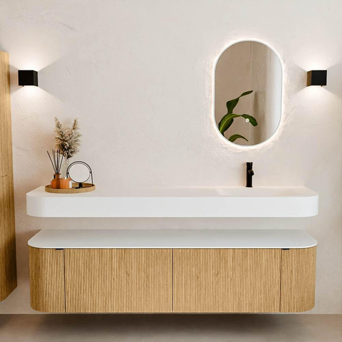 Boven het meubel zweeft een bijpassende, vrij hangende wastafel met afgeronde hoeken – perfect afgestemd op de vorm van de kast. De wastafel is uitgevoerd in Solid Surface en volgt subtiel de lijnen van het onderliggende meubel, waardoor een harmonieus geheel ontstaat. Het Solid Surface topblad vormt een sterke, onderhoudsvriendelijke basis en maakt de combinatie compleet.