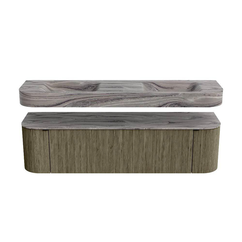 Boven het meubel zweeft een bijpassende, vrij hangende wastafel met afgeronde hoeken – perfect afgestemd op de vorm van de kast. De wastafel is uitgevoerd in Solid Surface en volgt subtiel de lijnen van het onderliggende meubel, waardoor een harmonieus geheel ontstaat. Het Solid Surface topblad vormt een sterke, onderhoudsvriendelijke basis en maakt de combinatie compleet.