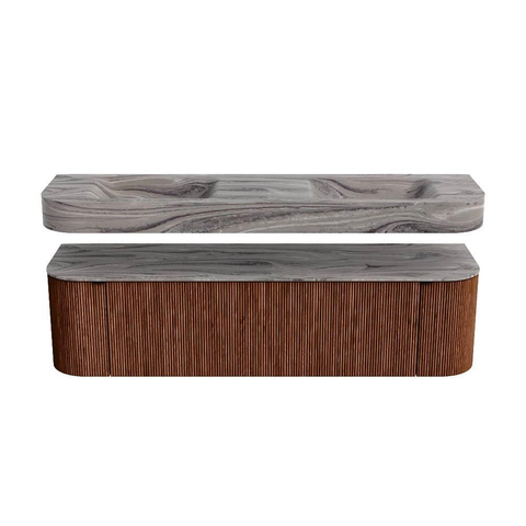 Boven het meubel zweeft een bijpassende, vrij hangende wastafel met afgeronde hoeken – perfect afgestemd op de vorm van de kast. De wastafel is uitgevoerd in Solid Surface en volgt subtiel de lijnen van het onderliggende meubel, waardoor een harmonieus geheel ontstaat. Het Solid Surface topblad vormt een sterke, onderhoudsvriendelijke basis en maakt de combinatie compleet.