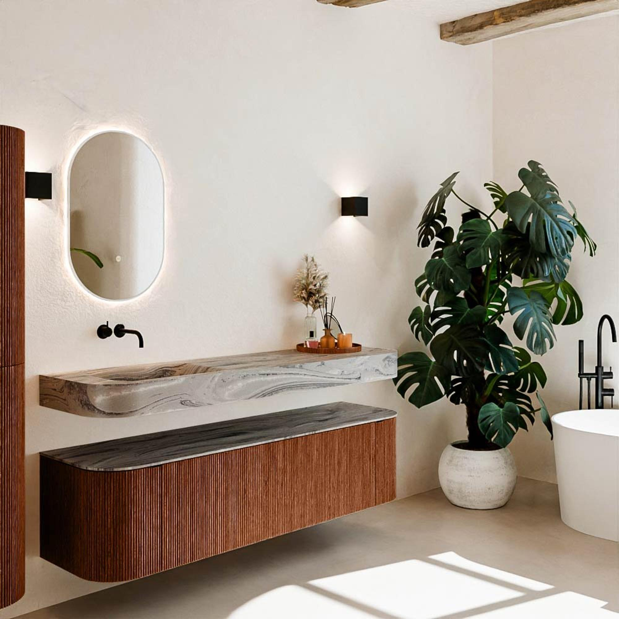 Natuurlijke materialen in warme tinten. De verticale ribbels brengen ritme en textuur in het ontwerp, terwijl het eikenhout zorgt voor een warme, ambachtelijke uitstraling. Kies uit 5 houttinten OAK, WALNUT, DUSK, SHADOW en RUBY zorgvuldig geselecteerde houtkleuren om zowel moderne als klassieke badkamers te verrijken.