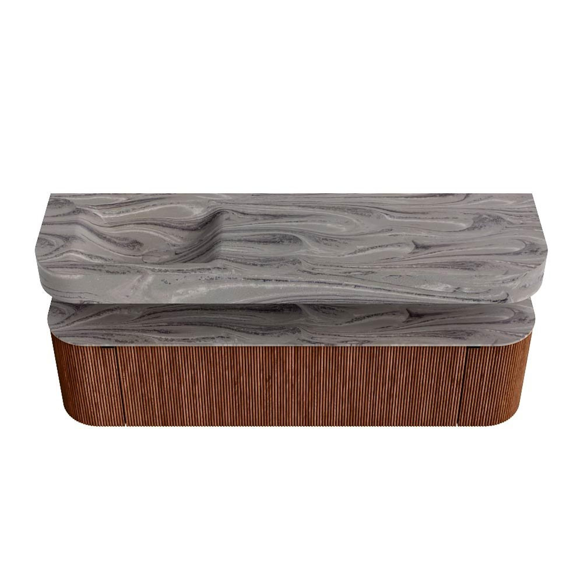Boven het meubel zweeft een bijpassende, vrij hangende wastafel met afgeronde hoeken – perfect afgestemd op de vorm van de kast. De wastafel is uitgevoerd in Solid Surface en volgt subtiel de lijnen van het onderliggende meubel, waardoor een harmonieus geheel ontstaat. Het Solid Surface topblad vormt een sterke, onderhoudsvriendelijke basis en maakt de combinatie compleet.