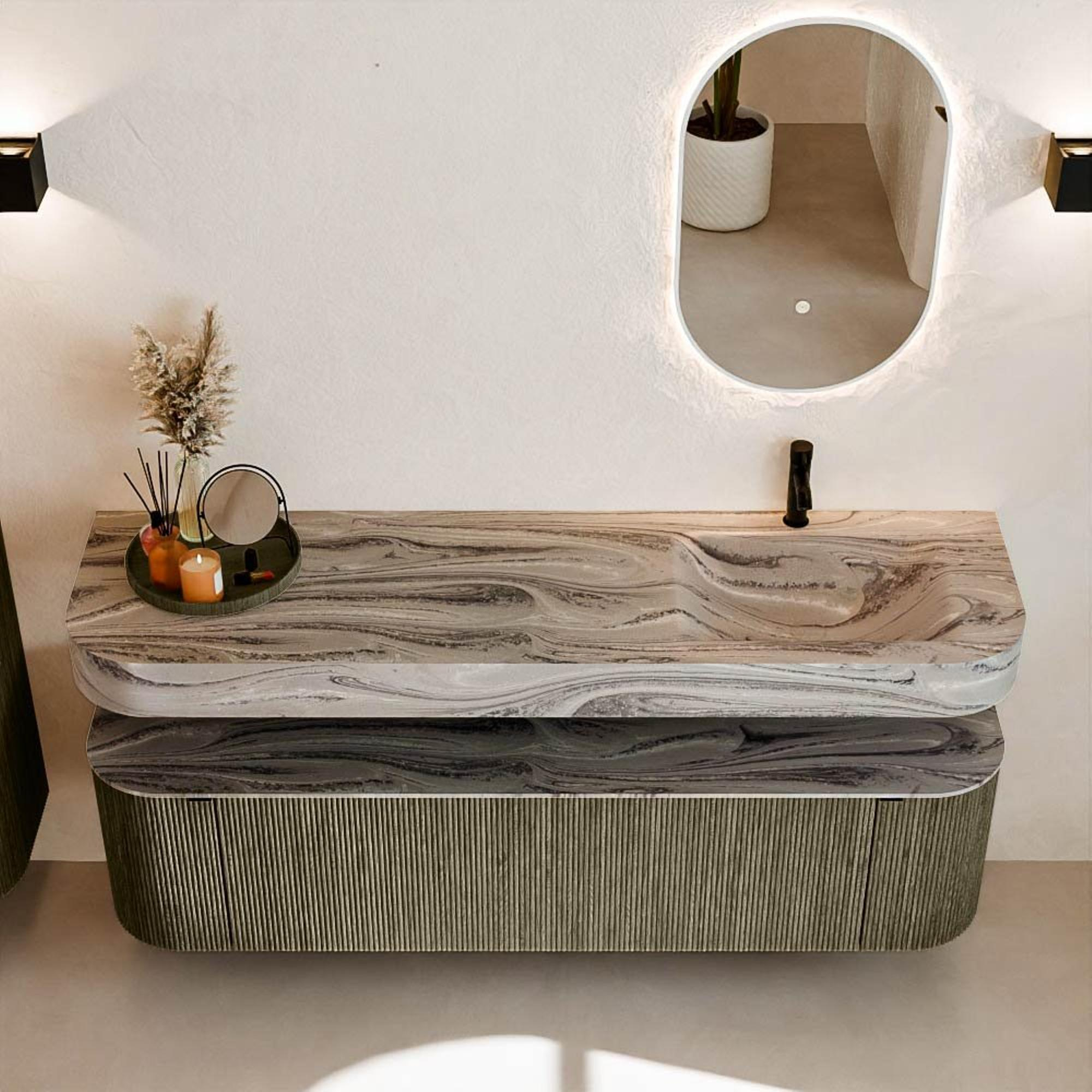 Boven het meubel zweeft een bijpassende, vrij hangende wastafel met afgeronde hoeken – perfect afgestemd op de vorm van de kast. De wastafel is uitgevoerd in Solid Surface en volgt subtiel de lijnen van het onderliggende meubel, waardoor een harmonieus geheel ontstaat. Het Solid Surface topblad vormt een sterke, onderhoudsvriendelijke basis en maakt de combinatie compleet.