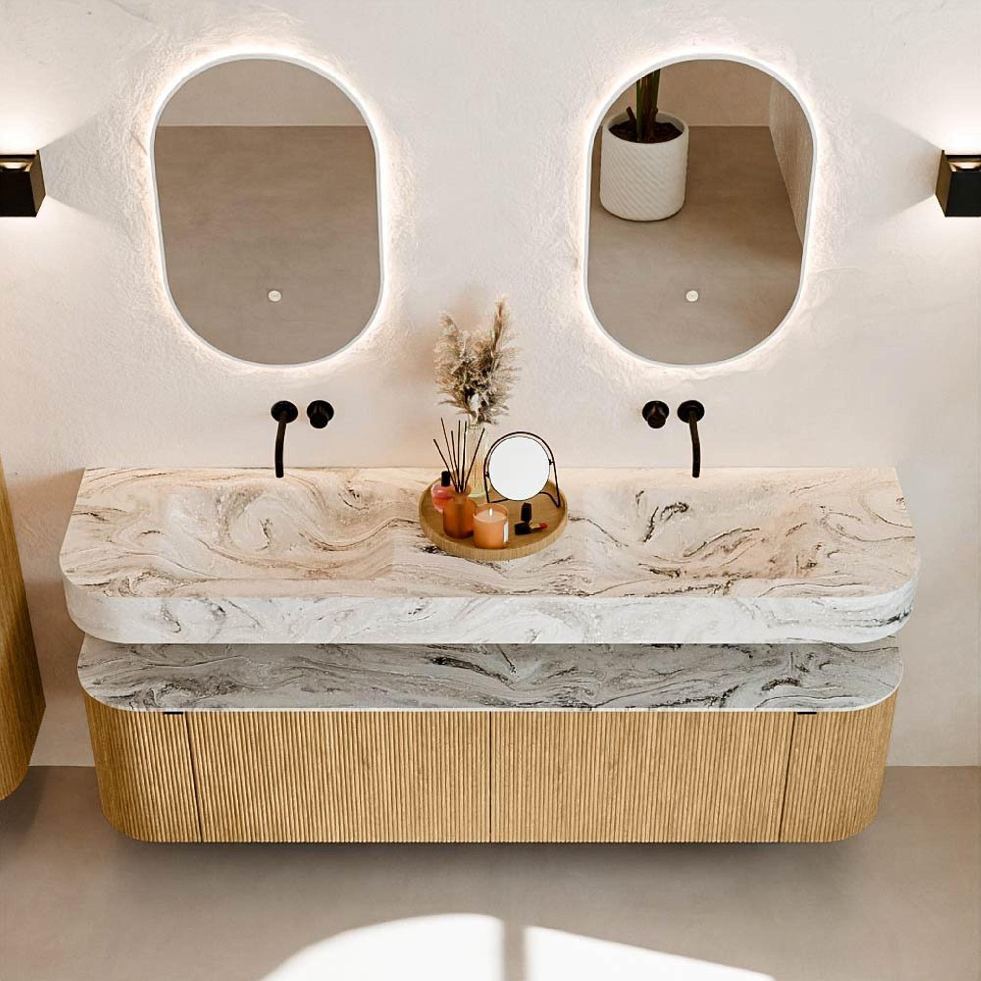MONDIAZ THOR-DLUX 180cm badmeubel ronding links + rechts kleur Oak met 2 lades en 2 deuren. Vrijhangende wastafel CLOUD Dubbel zonder kraangat kleur Glace.