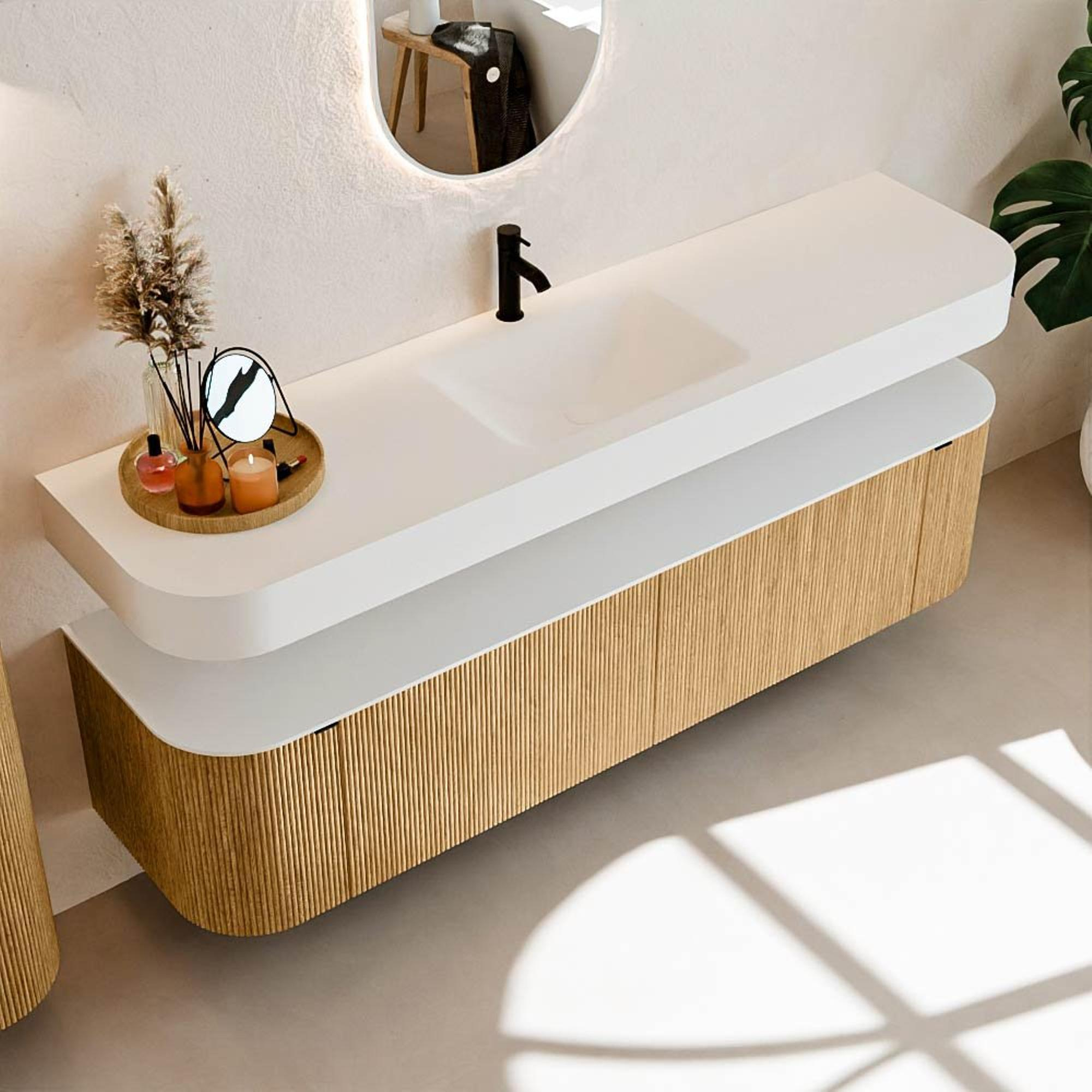 Boven het meubel zweeft een bijpassende, vrij hangende wastafel met afgeronde hoeken – perfect afgestemd op de vorm van de kast. De wastafel is uitgevoerd in Solid Surface en volgt subtiel de lijnen van het onderliggende meubel, waardoor een harmonieus geheel ontstaat. Het Solid Surface topblad vormt een sterke, onderhoudsvriendelijke basis en maakt de combinatie compleet.