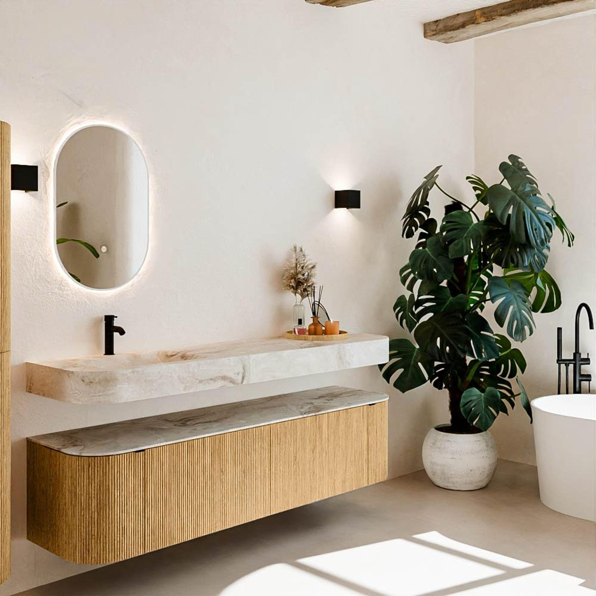 Natuurlijke materialen in warme tinten. De verticale ribbels brengen ritme en textuur in het ontwerp, terwijl het eikenhout zorgt voor een warme, ambachtelijke uitstraling. Kies uit 5 houttinten OAK, WALNUT, DUSK, SHADOW en RUBY zorgvuldig geselecteerde houtkleuren om zowel moderne als klassieke badkamers te verrijken.