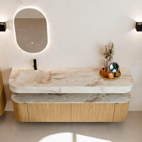 MONDIAZ THOR-DLUX 180cm badmeubel ronding links + rechts kleur Oak met 2 lades en 2 deuren. Vrijhangende wastafel CLOUD Links 1 kraangat kleur Frappe.