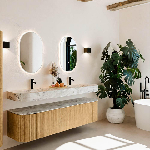 MONDIAZ THOR-DLUX 180cm badmeubel ronding links + rechts kleur Oak met 2 lades en 2 deuren. Vrijhangende wastafel CLOUD Dubbel 2 kraangaten kleur Glace.
