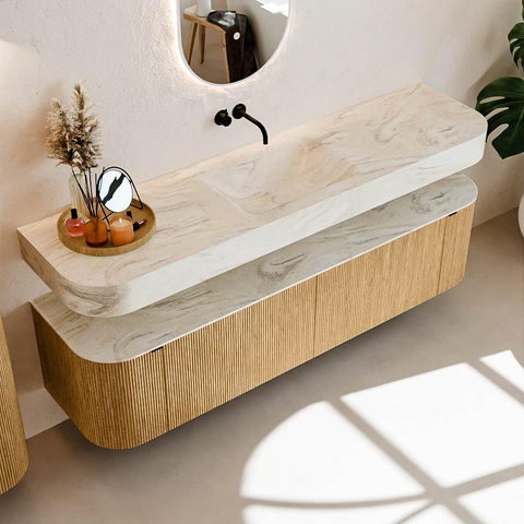 MONDIAZ THOR-DLUX 180cm badmeubel ronding links + rechts kleur Oak met 2 lades en 2 deuren. Vrijhangende wastafel CLOUD Midden zonder kraangat kleur Ostra.