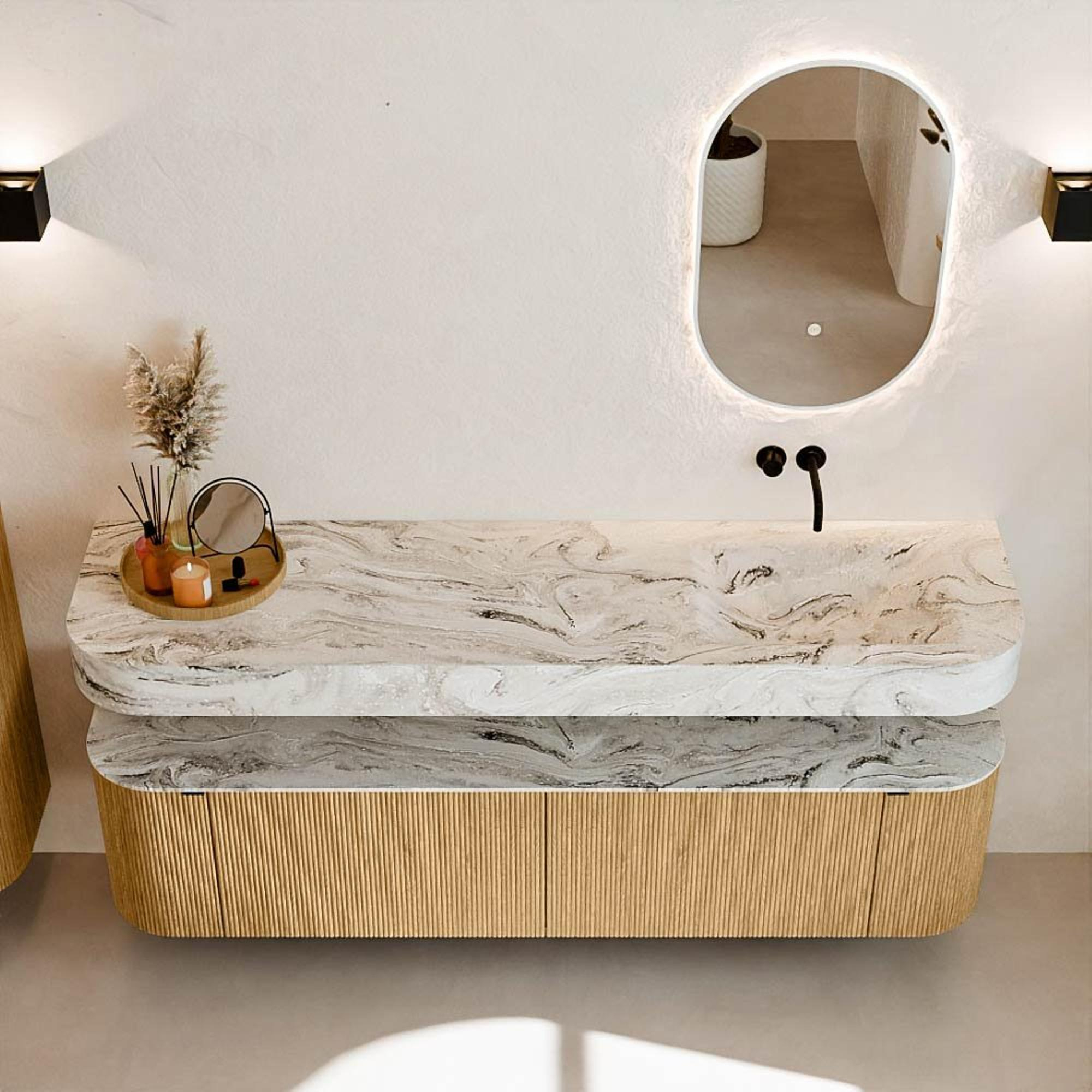 MONDIAZ THOR-DLUX 180cm badmeubel ronding links + rechts kleur Oak met 2 lades en 2 deuren. Vrijhangende wastafel CLOUD Rechts zonder kraangat kleur Glace.