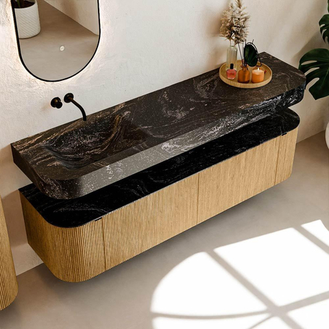 Natuurlijke materialen in warme tinten. De verticale ribbels brengen ritme en textuur in het ontwerp, terwijl het eikenhout zorgt voor een warme, ambachtelijke uitstraling. Kies uit 5 houttinten OAK, WALNUT, DUSK, SHADOW en RUBY zorgvuldig geselecteerde houtkleuren om zowel moderne als klassieke badkamers te verrijken.