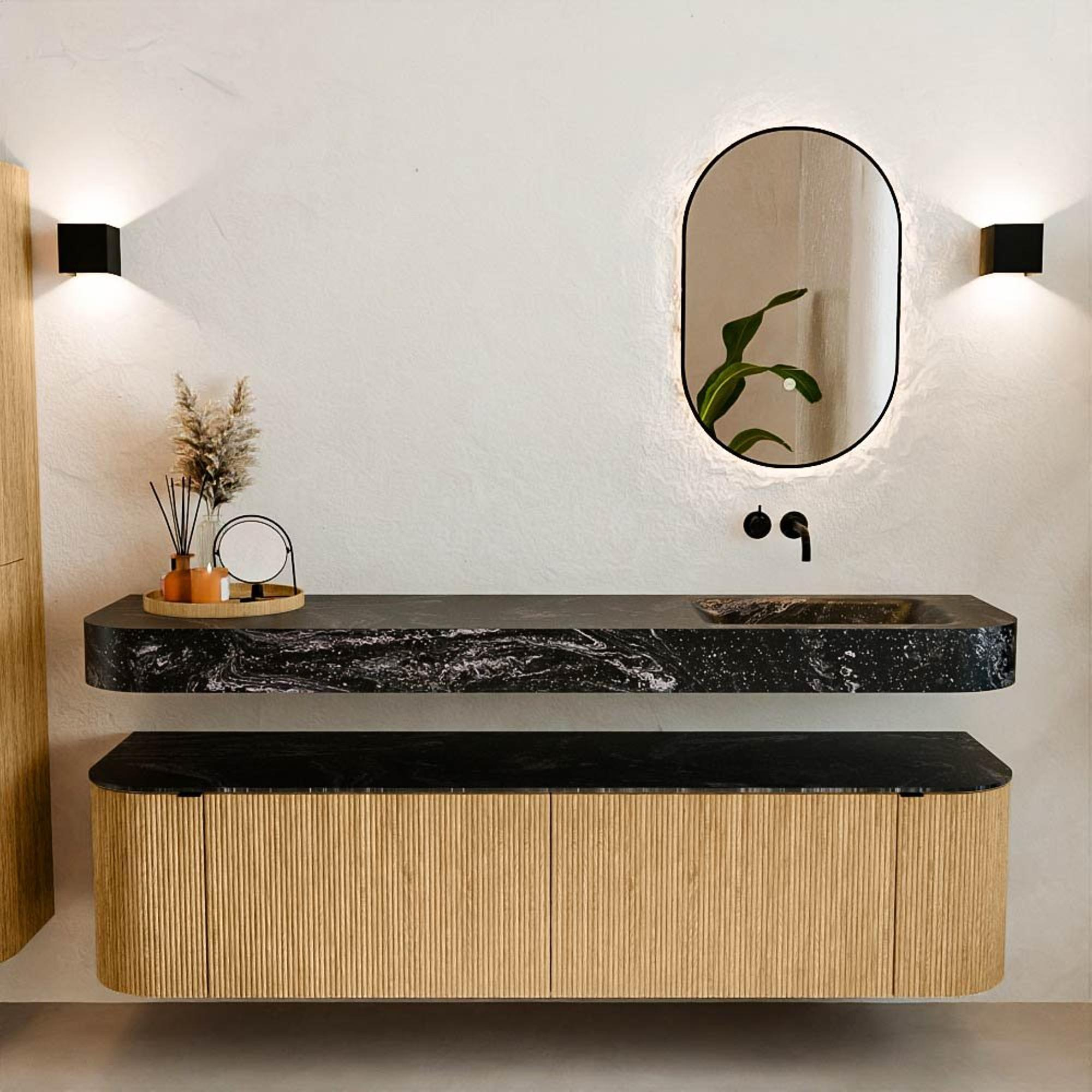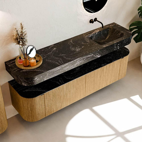 MONDIAZ THOR-DLUX 180cm badmeubel ronding links + rechts kleur Oak met 2 lades en 2 deuren. Vrijhangende wastafel CLOUD Rechts zonder kraangat kleur Lava.