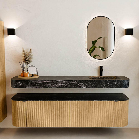 MONDIAZ THOR-DLUX 180cm badmeubel ronding links + rechts kleur Oak met 2 lades en 2 deuren. Vrijhangende wastafel CLOUD Rechts 1 kraangat kleur Lava.