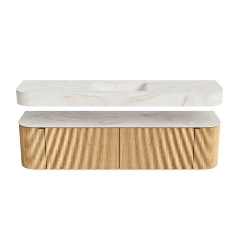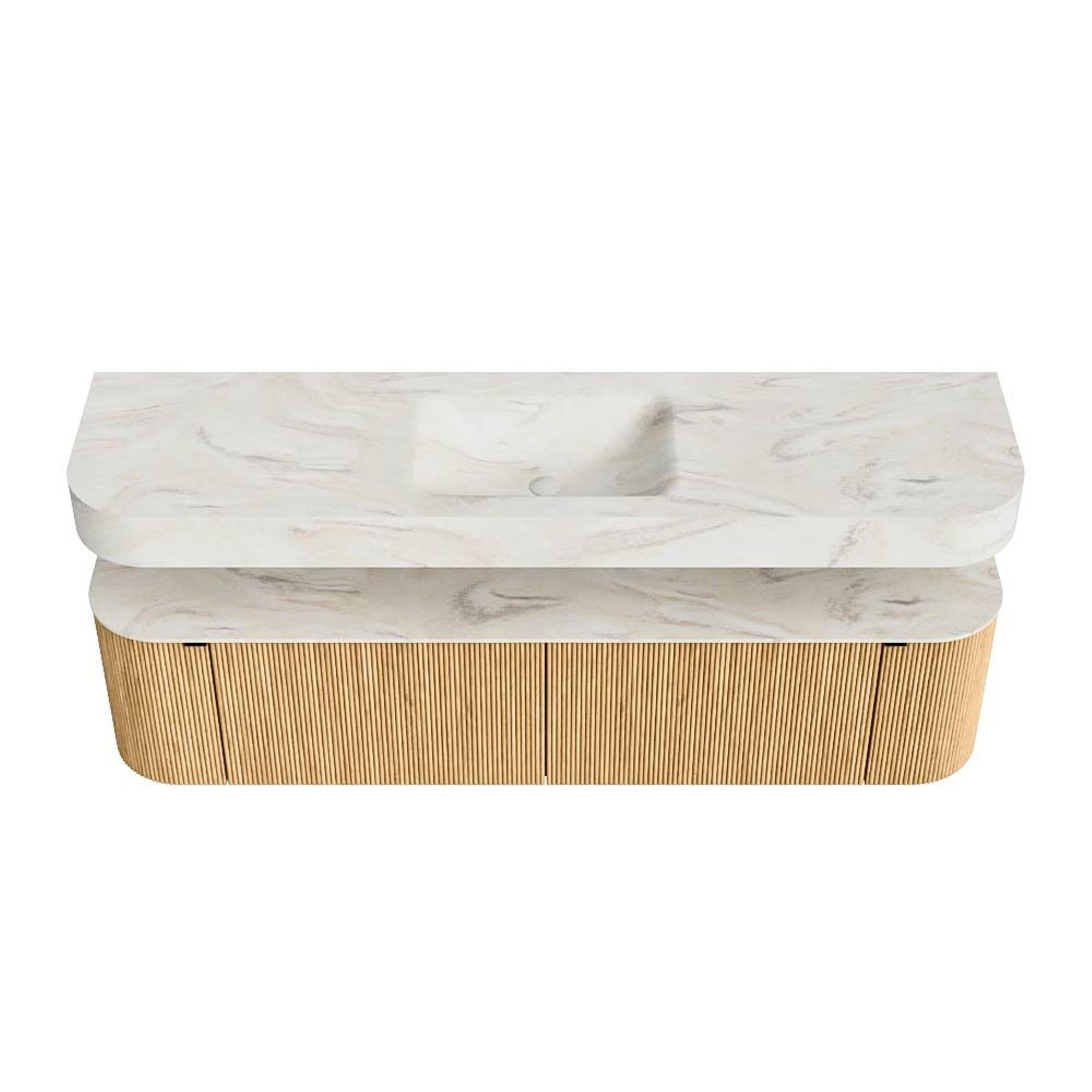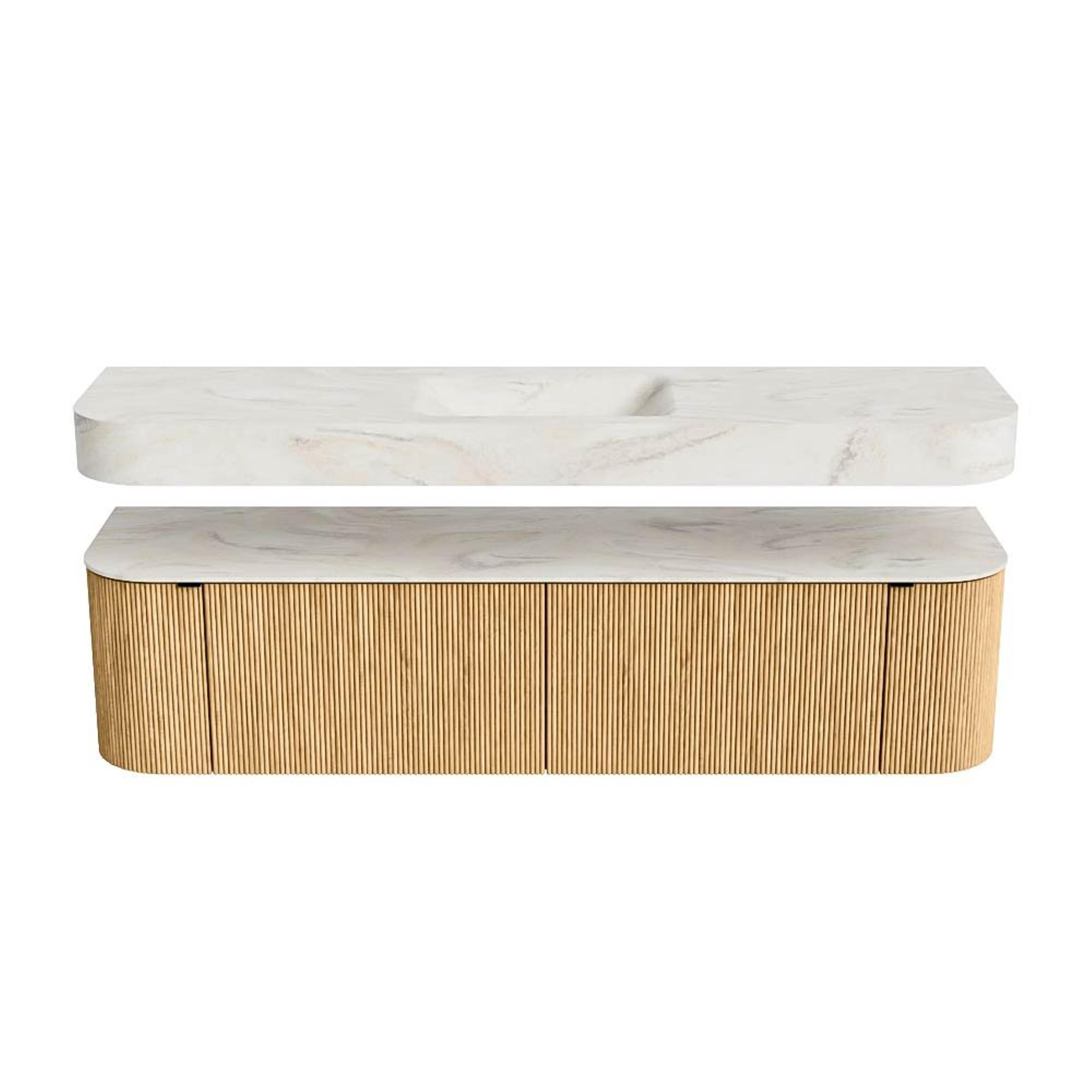 MONDIAZ THOR-DLUX 180cm badmeubel ronding links + rechts kleur Oak met 2 lades en 2 deuren. Vrijhangende wastafel CLOUD Midden 1 kraangat kleur Ostra.