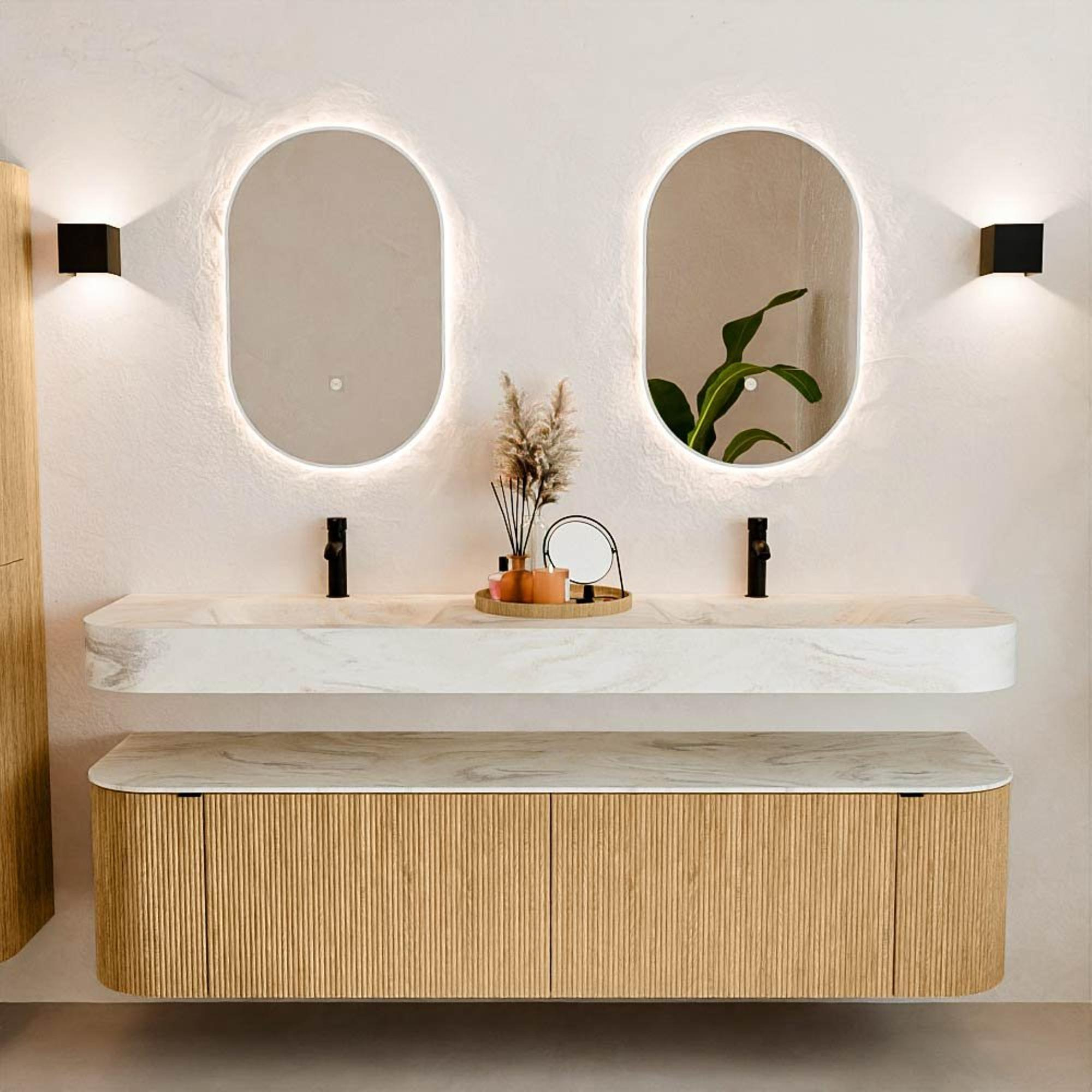 MONDIAZ THOR-DLUX 180cm badmeubel ronding links + rechts kleur Oak met 2 lades en 2 deuren. Vrijhangende wastafel CLOUD Dubbel 2 kraangaten kleur Ostra.