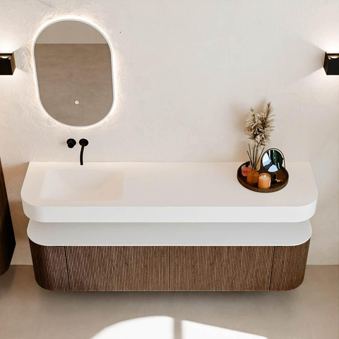 MONDIAZ THOR 180cm badmeubel ronding links + rechts kleur Walnut met 2 lades en 2 deuren. Vrijhangende wastafel CLOUD Links zonder kraangat kleur Talc.