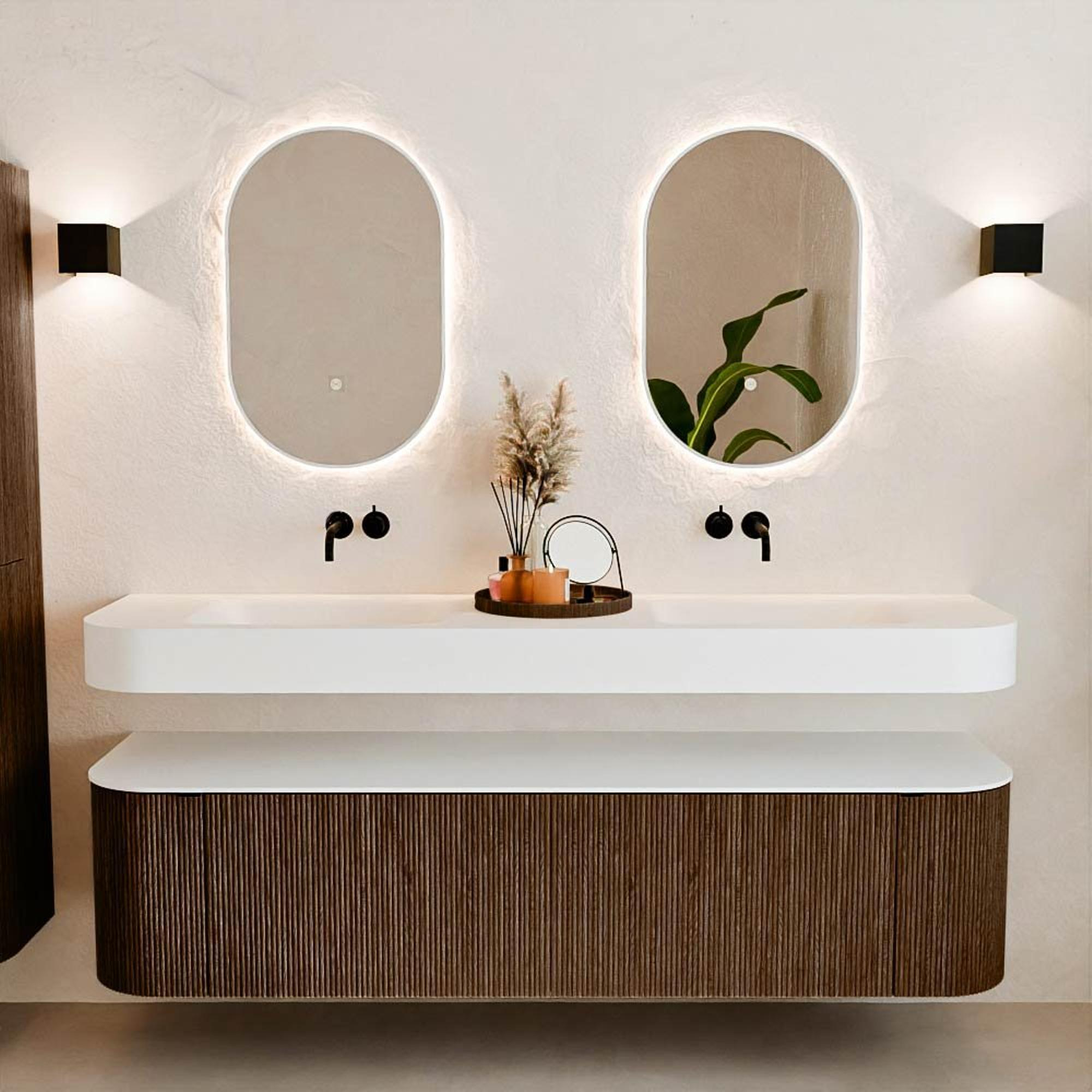 Natuurlijke materialen in warme tinten. De verticale ribbels brengen ritme en textuur in het ontwerp, terwijl het eikenhout zorgt voor een warme, ambachtelijke uitstraling. Kies uit 5 houttinten OAK, WALNUT, DUSK, SHADOW en RUBY zorgvuldig geselecteerde houtkleuren om zowel moderne als klassieke badkamers te verrijken.