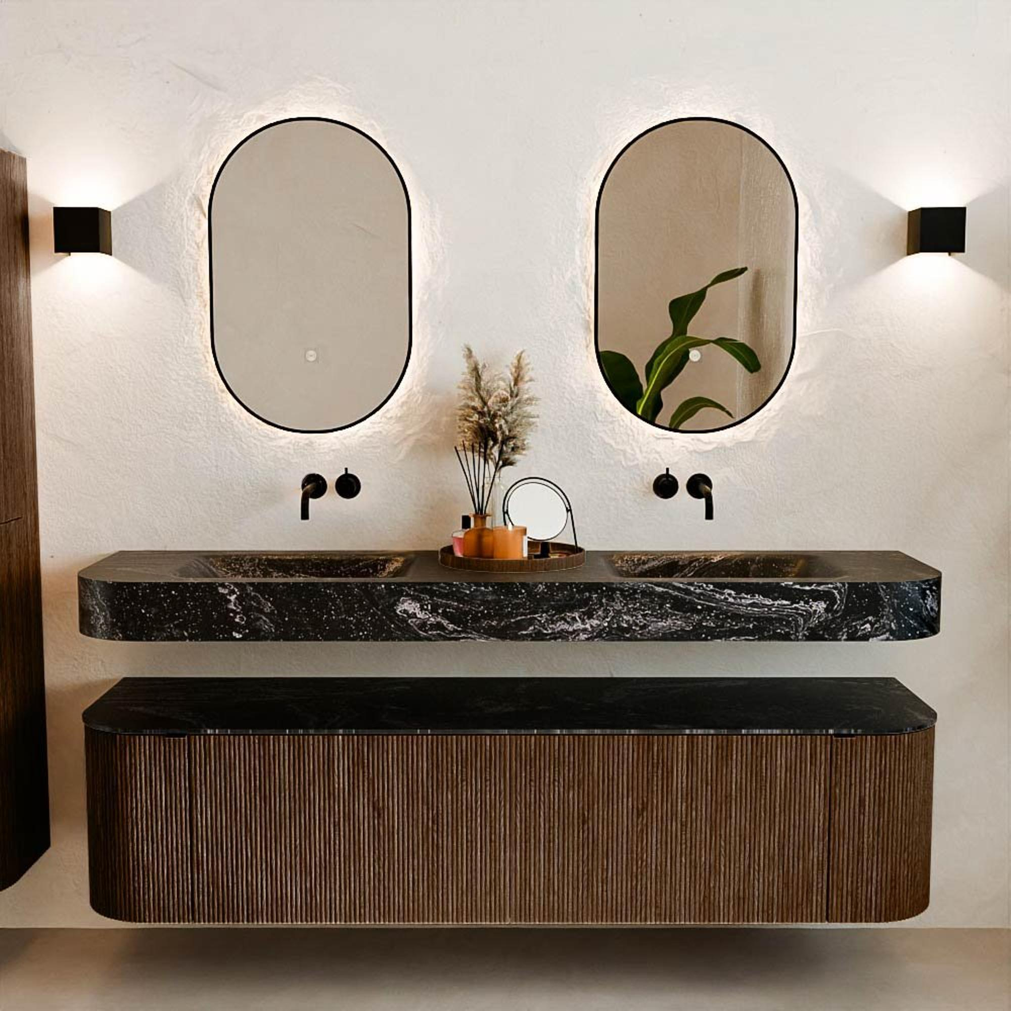 Natuurlijke materialen in warme tinten. De verticale ribbels brengen ritme en textuur in het ontwerp, terwijl het eikenhout zorgt voor een warme, ambachtelijke uitstraling. Kies uit 5 houttinten OAK, WALNUT, DUSK, SHADOW en RUBY zorgvuldig geselecteerde houtkleuren om zowel moderne als klassieke badkamers te verrijken.