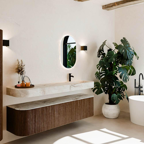 Natuurlijke materialen in warme tinten. De verticale ribbels brengen ritme en textuur in het ontwerp, terwijl het eikenhout zorgt voor een warme, ambachtelijke uitstraling. Kies uit 5 houttinten OAK, WALNUT, DUSK, SHADOW en RUBY zorgvuldig geselecteerde houtkleuren om zowel moderne als klassieke badkamers te verrijken.