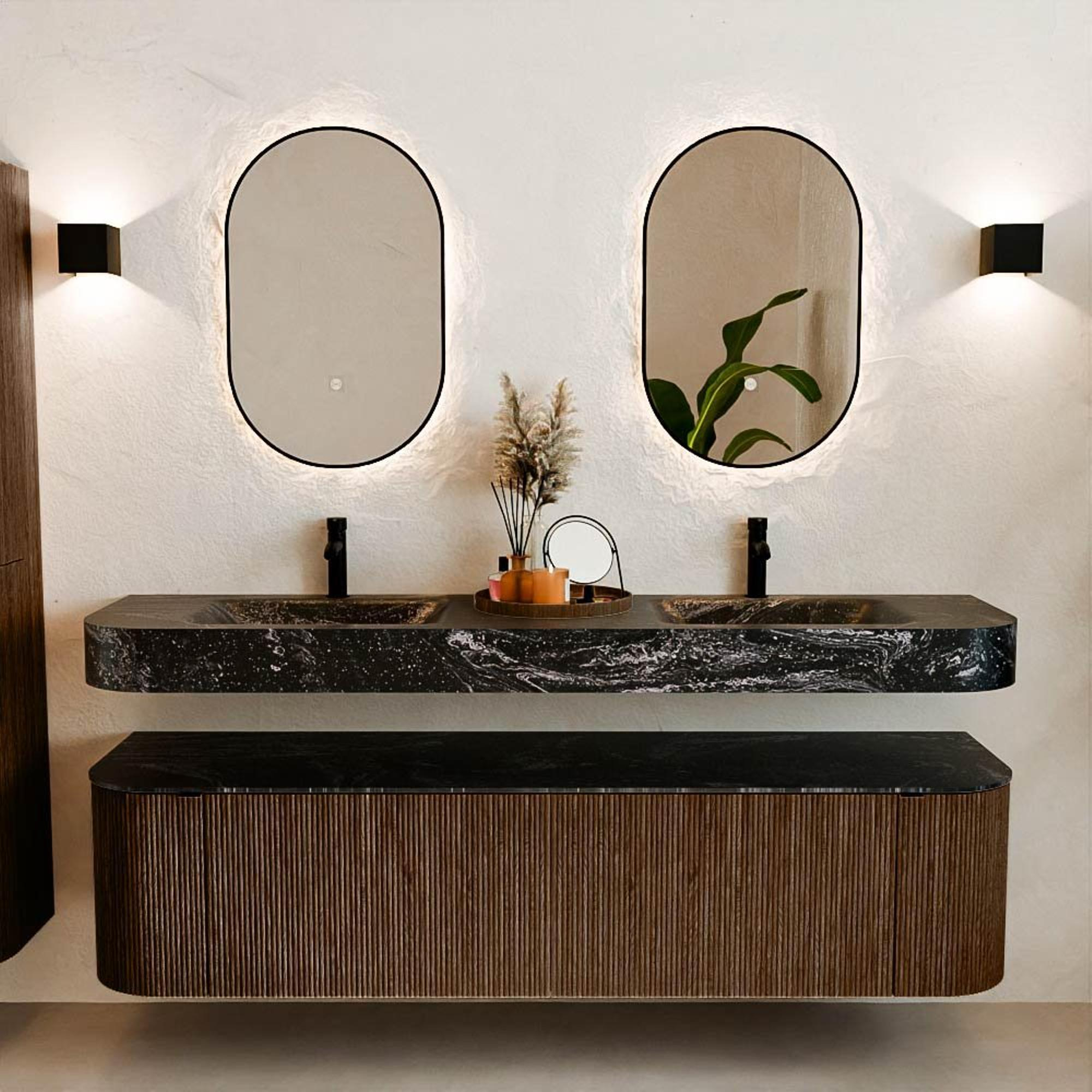 MONDIAZ THOR-DLUX 180cm badmeubel ronding links + rechts kleur Walnut met 2 lades en 2 deuren. Vrijhangende wastafel CLOUD Dubbel 2 kraangaten kleur Lava.