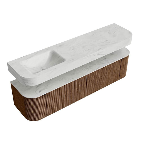 MONDIAZ THOR-DLUX 180cm badmeubel ronding links + rechts kleur Walnut met 2 lades en 2 deuren. Vrijhangende wastafel CLOUD Links 1 kraangat kleur Opalo.