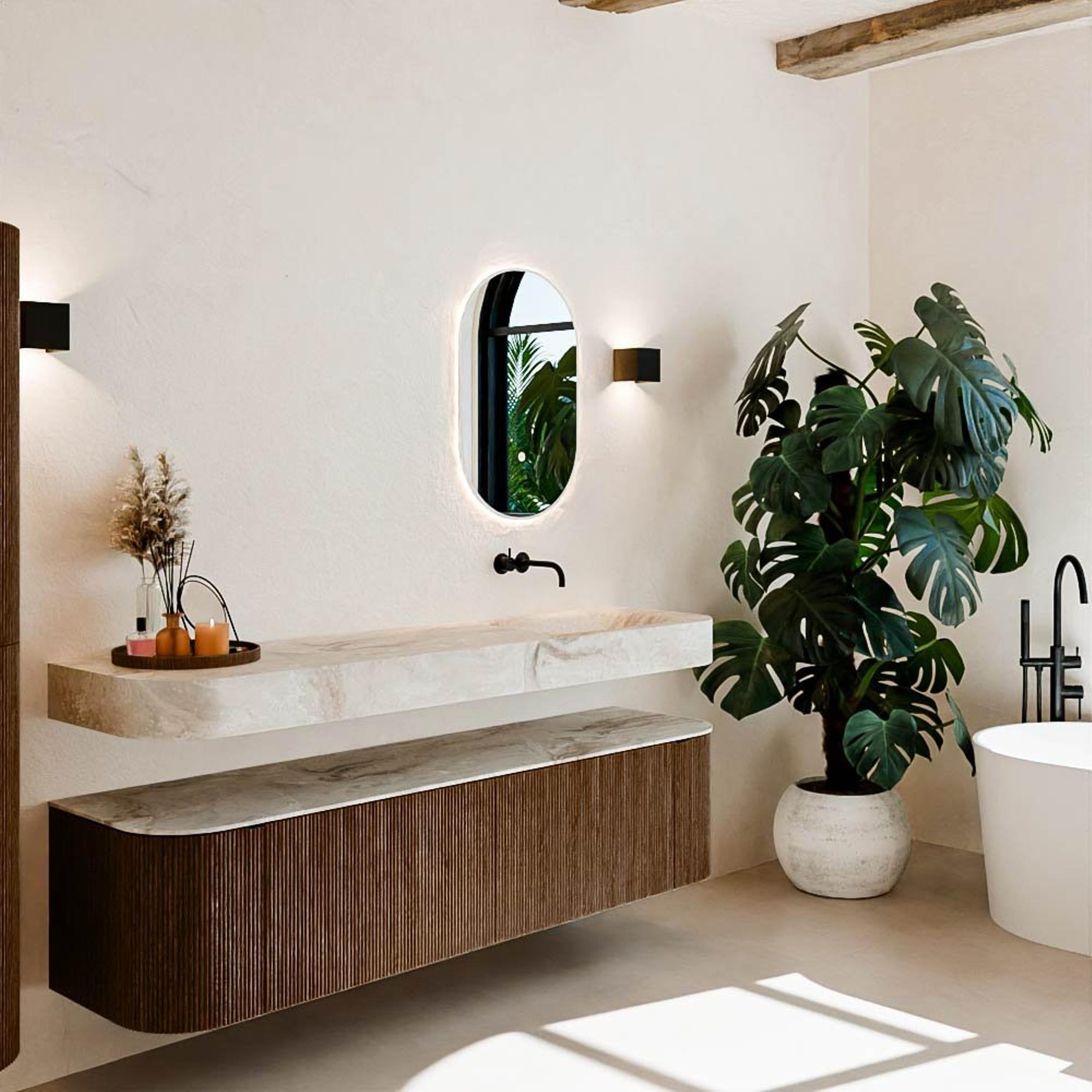 Natuurlijke materialen in warme tinten. De verticale ribbels brengen ritme en textuur in het ontwerp, terwijl het eikenhout zorgt voor een warme, ambachtelijke uitstraling. Kies uit 5 houttinten OAK, WALNUT, DUSK, SHADOW en RUBY zorgvuldig geselecteerde houtkleuren om zowel moderne als klassieke badkamers te verrijken.