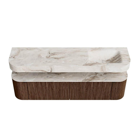 MONDIAZ THOR-DLUX 180cm badmeubel ronding links + rechts kleur Walnut met 2 lades en 2 deuren. Vrijhangende wastafel CLOUD Rechts zonder kraangat kleur Frappe.