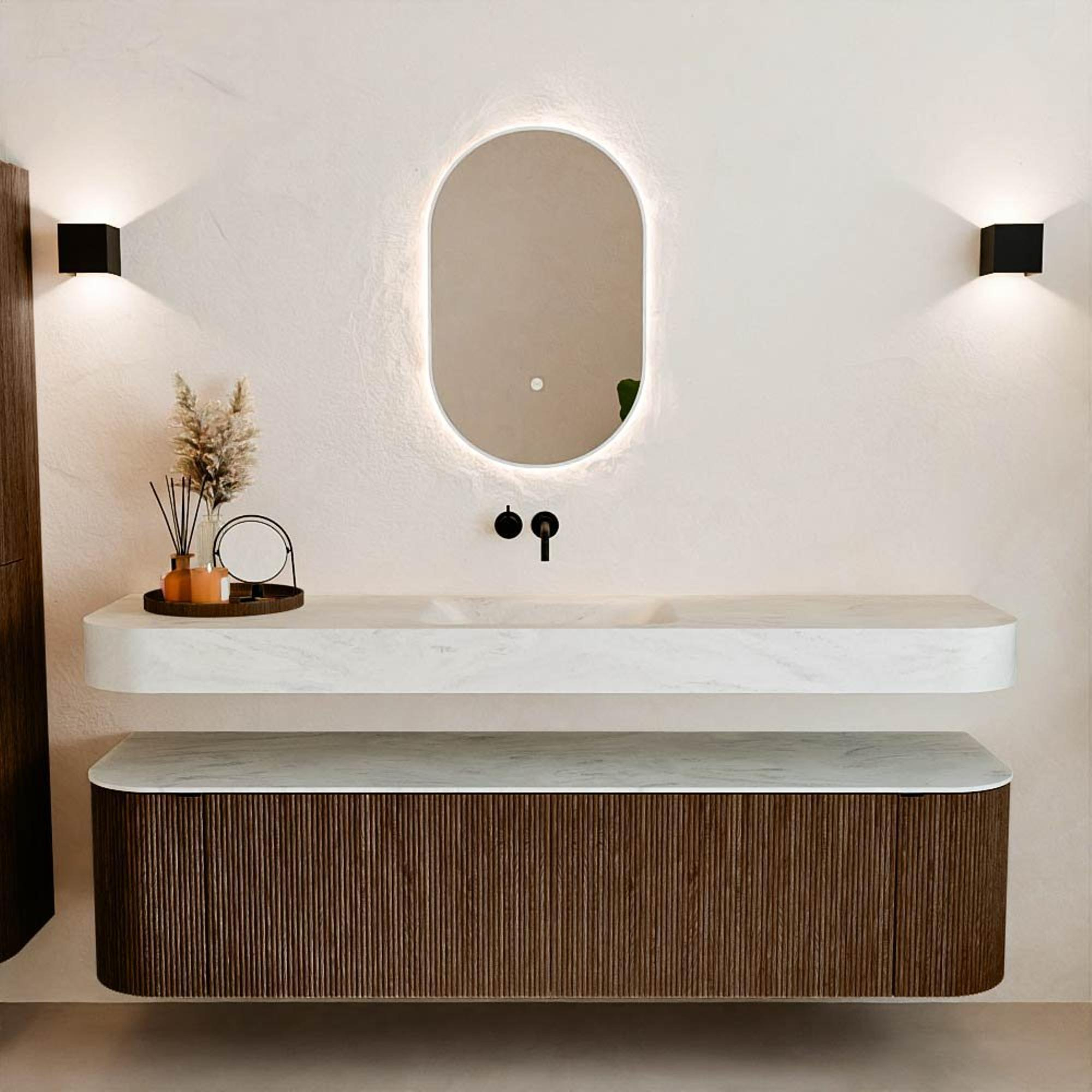 Natuurlijke materialen in warme tinten. De verticale ribbels brengen ritme en textuur in het ontwerp, terwijl het eikenhout zorgt voor een warme, ambachtelijke uitstraling. Kies uit 5 houttinten OAK, WALNUT, DUSK, SHADOW en RUBY zorgvuldig geselecteerde houtkleuren om zowel moderne als klassieke badkamers te verrijken.