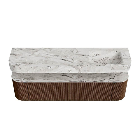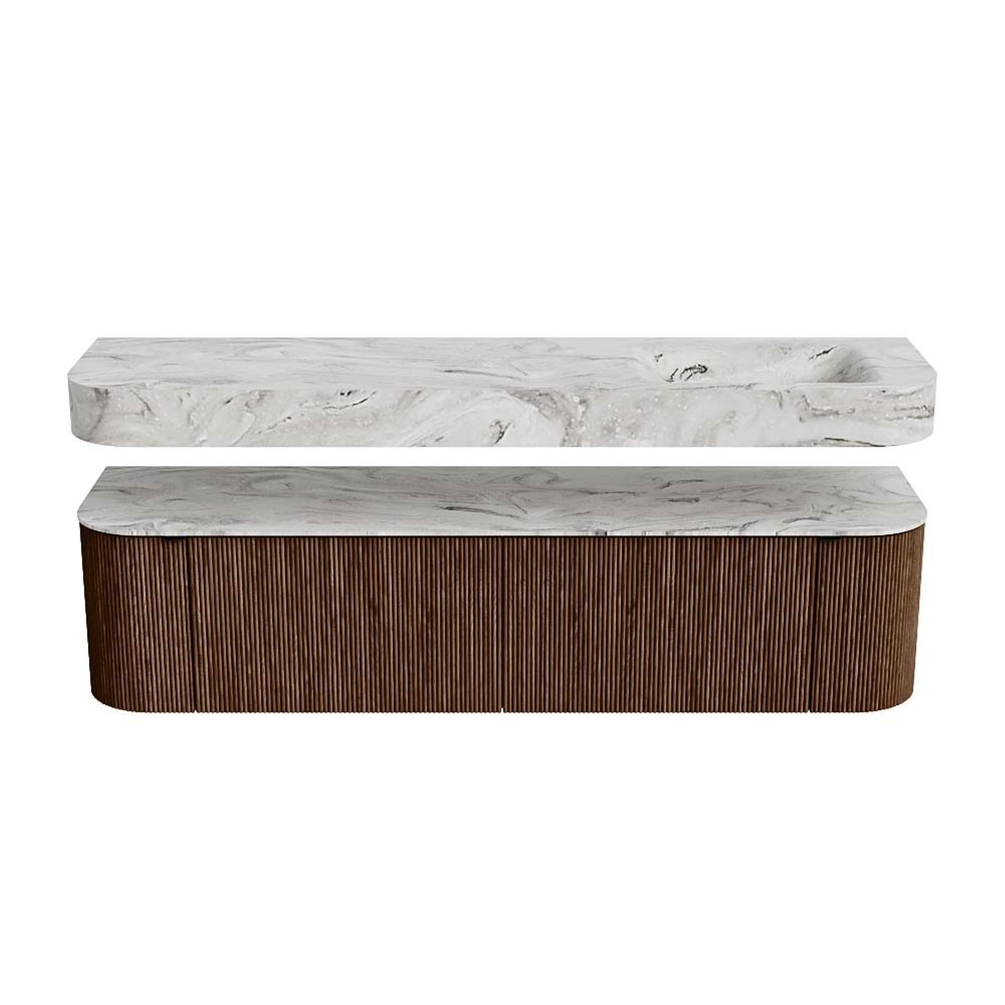 MONDIAZ THOR-DLUX 180cm badmeubel ronding links + rechts kleur Walnut met 2 lades en 2 deuren. Vrijhangende wastafel CLOUD Rechts 1 kraangat kleur Glace.