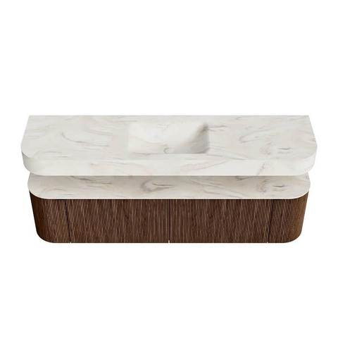 MONDIAZ THOR-DLUX 180cm badmeubel ronding links + rechts kleur Walnut met 2 lades en 2 deuren. Vrijhangende wastafel CLOUD Midden zonder kraangat kleur Ostra.