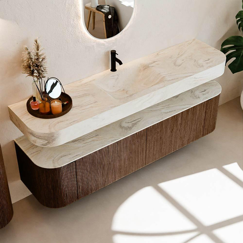 MONDIAZ THOR-DLUX 180cm badmeubel ronding links + rechts kleur Walnut met 2 lades en 2 deuren. Vrijhangende wastafel CLOUD Midden 1 kraangat kleur Ostra.
