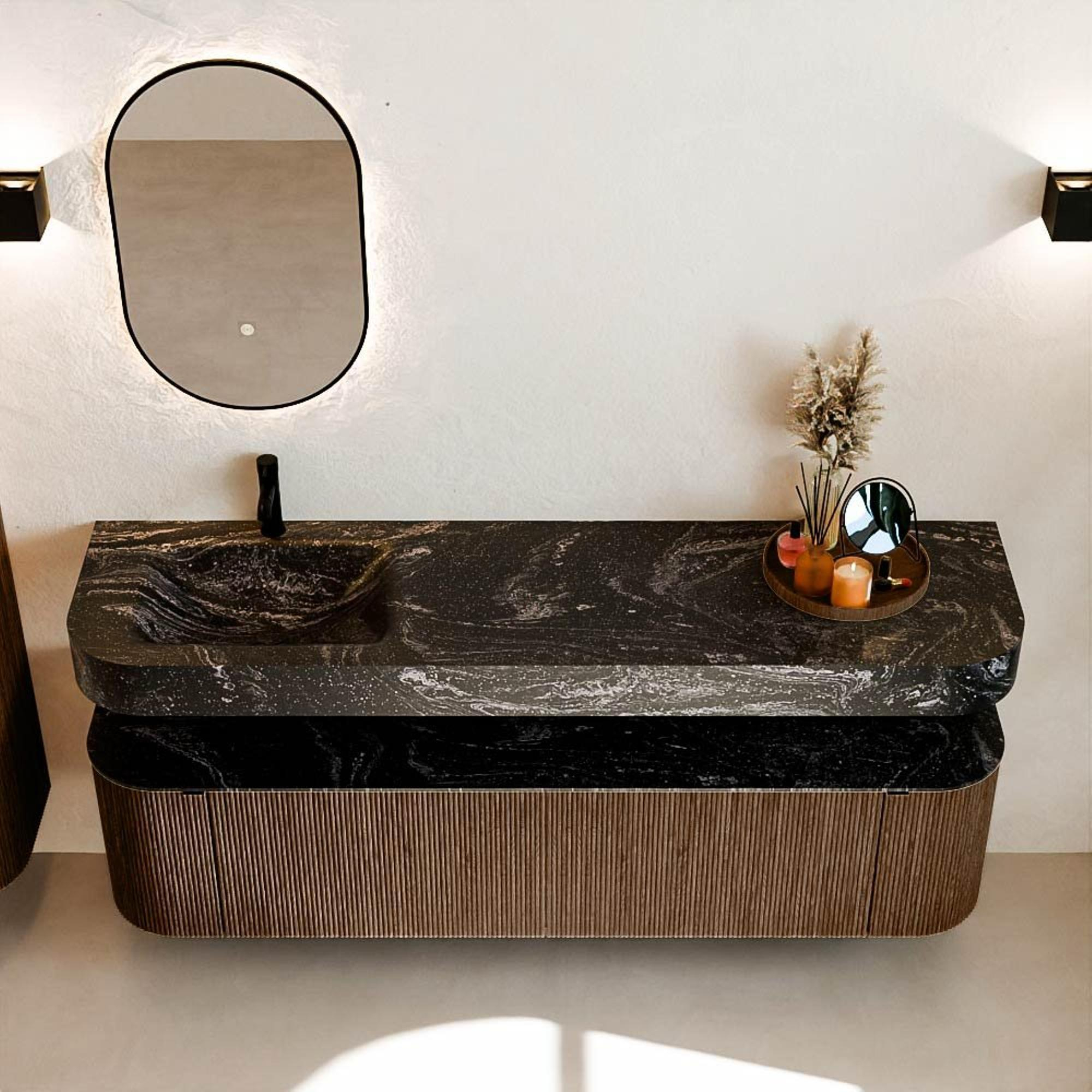 MONDIAZ THOR-DLUX 180cm badmeubel ronding links + rechts kleur Walnut met 2 lades en 2 deuren. Vrijhangende wastafel CLOUD Links 1 kraangat kleur Lava.