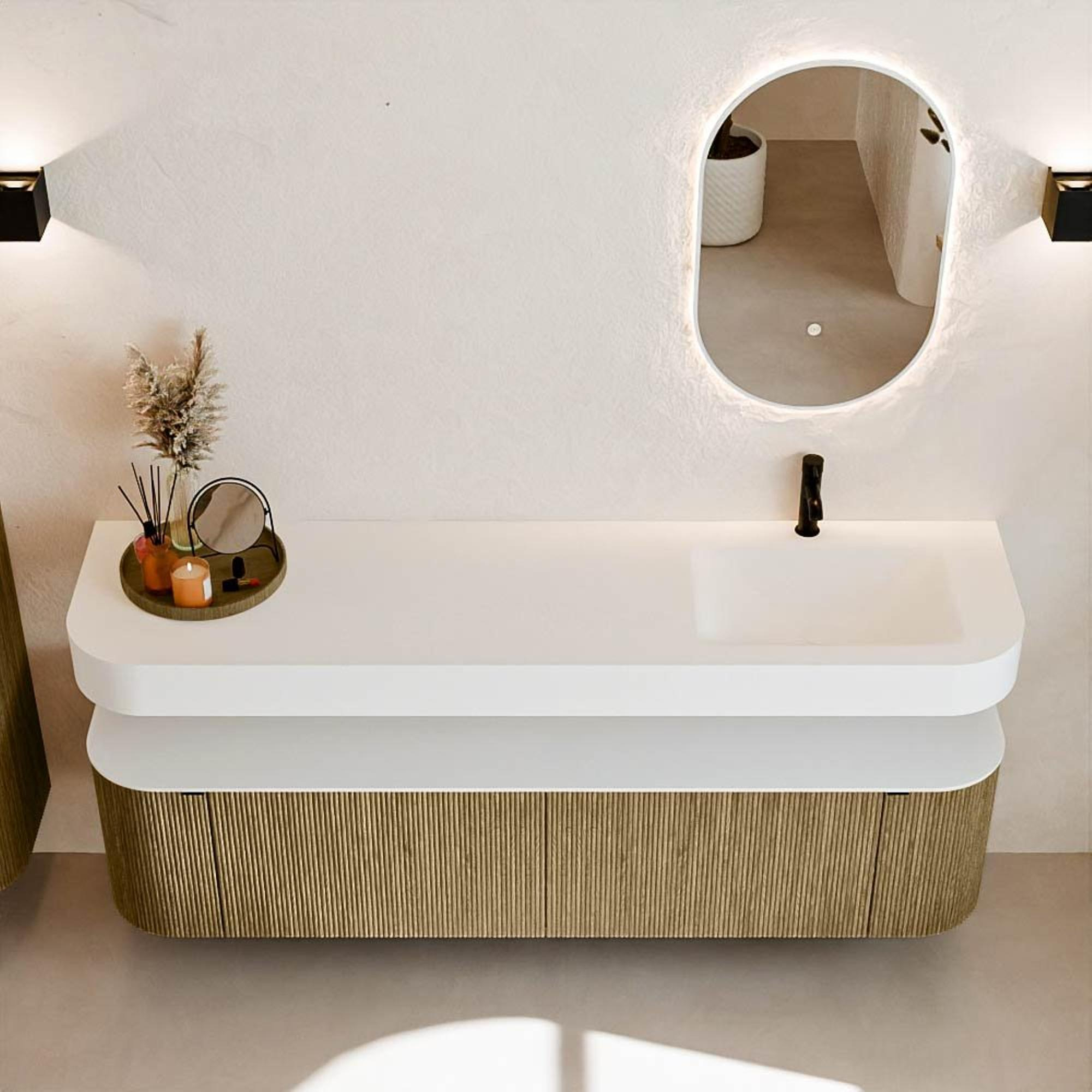 Boven het meubel zweeft een bijpassende, vrij hangende wastafel met afgeronde hoeken – perfect afgestemd op de vorm van de kast. De wastafel is uitgevoerd in Solid Surface en volgt subtiel de lijnen van het onderliggende meubel, waardoor een harmonieus geheel ontstaat. Het Solid Surface topblad vormt een sterke, onderhoudsvriendelijke basis en maakt de combinatie compleet.