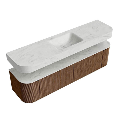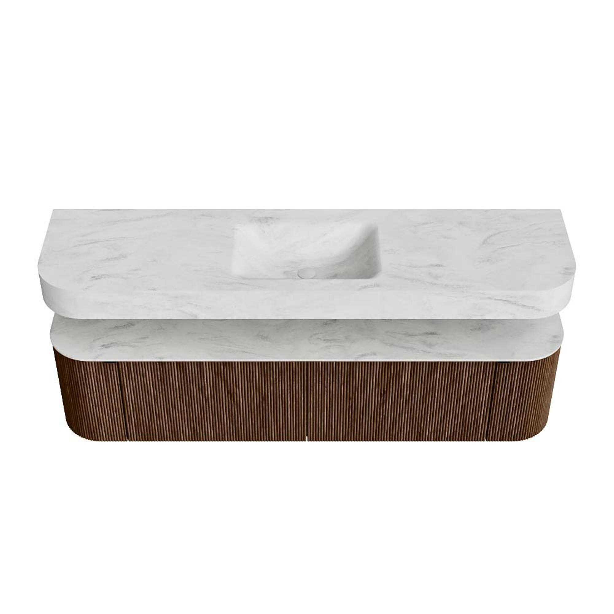 MONDIAZ THOR-DLUX 180cm badmeubel ronding links + rechts kleur Walnut met 2 lades en 2 deuren. Vrijhangende wastafel CLOUD Midden 1 kraangat kleur Opalo.