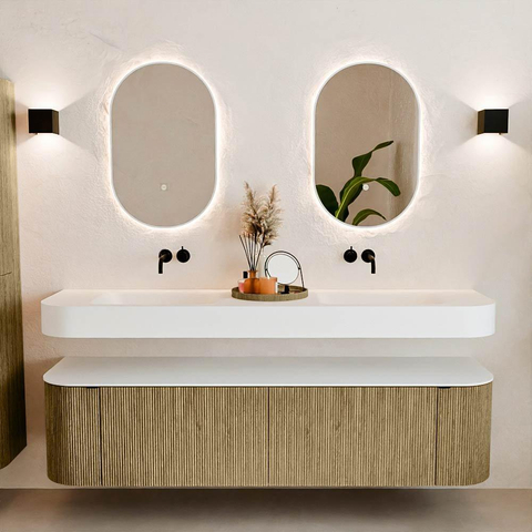 Natuurlijke materialen in warme tinten. De verticale ribbels brengen ritme en textuur in het ontwerp, terwijl het eikenhout zorgt voor een warme, ambachtelijke uitstraling. Kies uit 5 houttinten OAK, WALNUT, DUSK, SHADOW en RUBY zorgvuldig geselecteerde houtkleuren om zowel moderne als klassieke badkamers te verrijken.