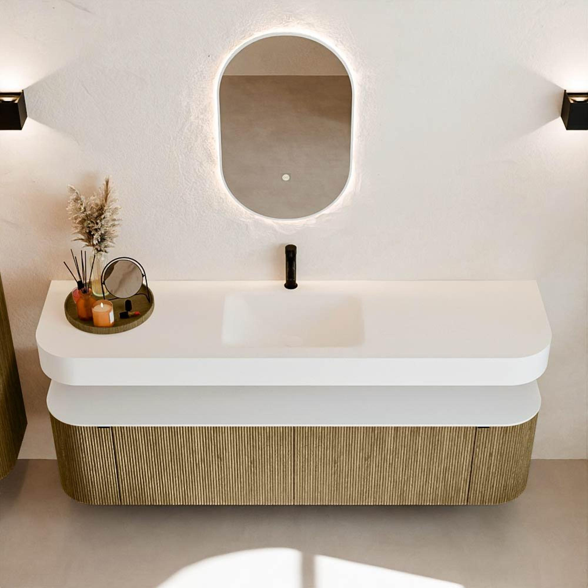 Boven het meubel zweeft een bijpassende, vrij hangende wastafel met afgeronde hoeken – perfect afgestemd op de vorm van de kast. De wastafel is uitgevoerd in Solid Surface en volgt subtiel de lijnen van het onderliggende meubel, waardoor een harmonieus geheel ontstaat. Het Solid Surface topblad vormt een sterke, onderhoudsvriendelijke basis en maakt de combinatie compleet.