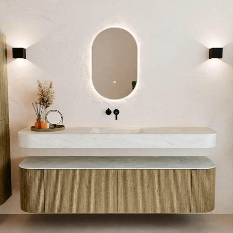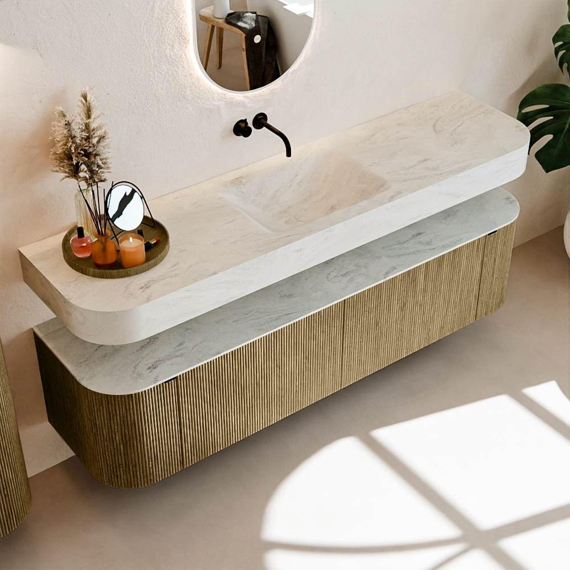 Boven het meubel zweeft een bijpassende, vrij hangende wastafel met afgeronde hoeken – perfect afgestemd op de vorm van de kast. De wastafel is uitgevoerd in Solid Surface en volgt subtiel de lijnen van het onderliggende meubel, waardoor een harmonieus geheel ontstaat. Het Solid Surface topblad vormt een sterke, onderhoudsvriendelijke basis en maakt de combinatie compleet.