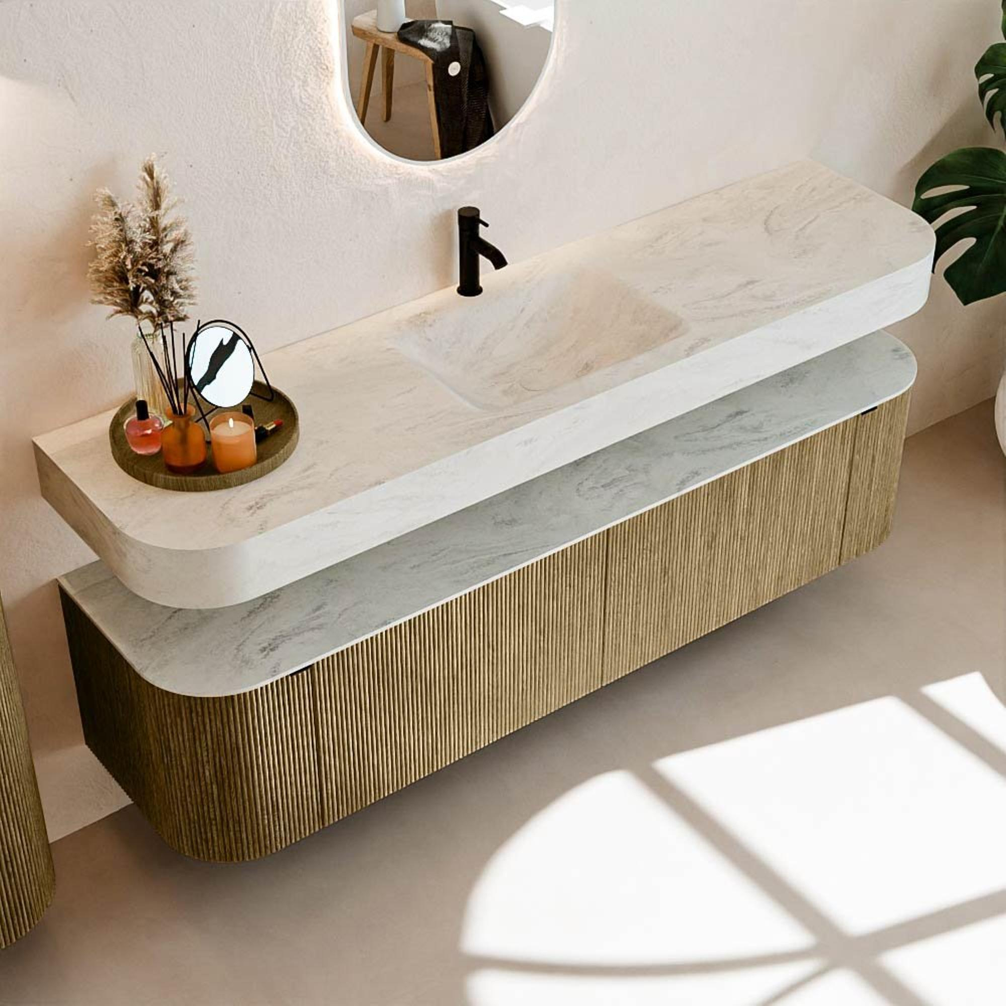 Boven het meubel zweeft een bijpassende, vrij hangende wastafel met afgeronde hoeken – perfect afgestemd op de vorm van de kast. De wastafel is uitgevoerd in Solid Surface en volgt subtiel de lijnen van het onderliggende meubel, waardoor een harmonieus geheel ontstaat. Het Solid Surface topblad vormt een sterke, onderhoudsvriendelijke basis en maakt de combinatie compleet.
