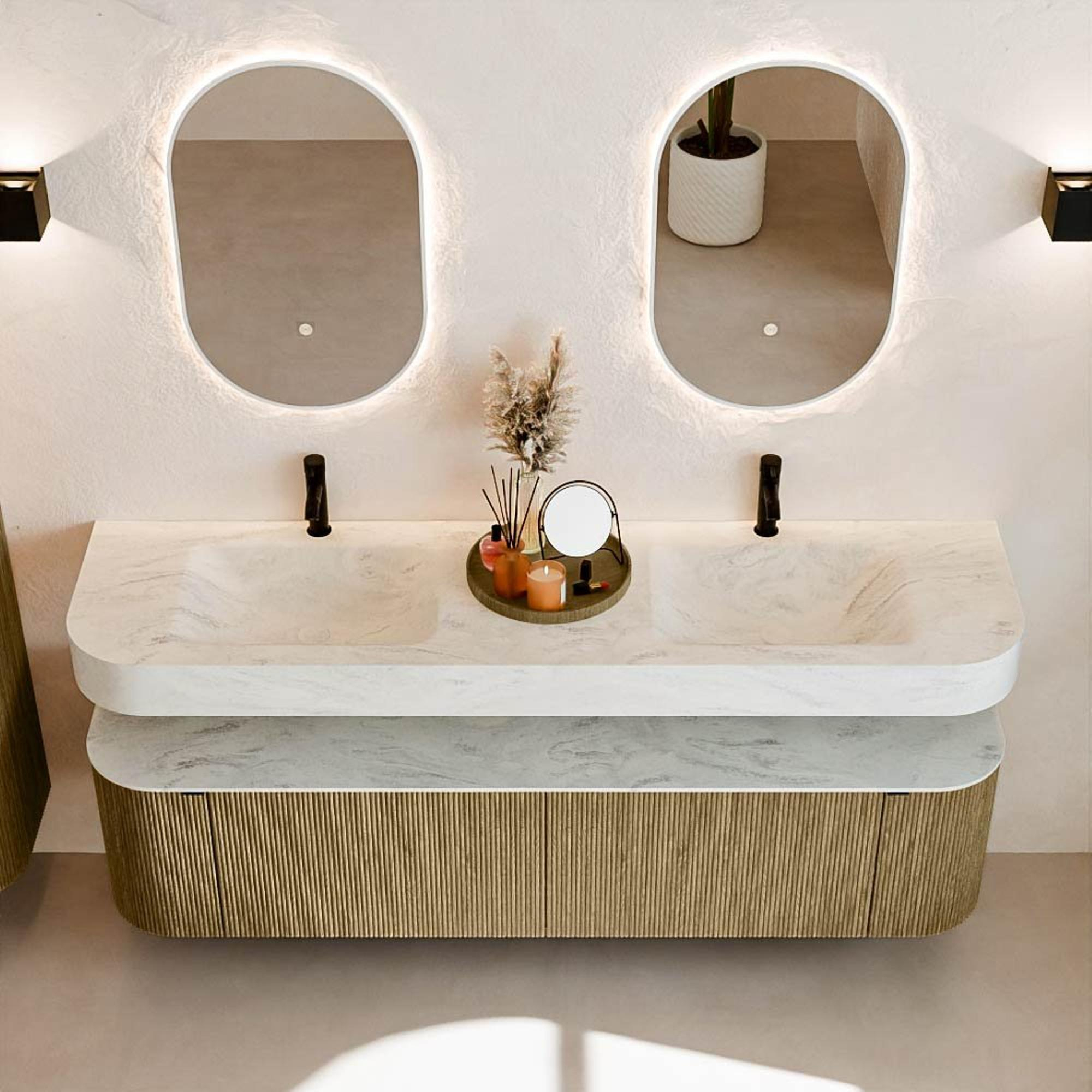 Natuurlijke materialen in warme tinten. De verticale ribbels brengen ritme en textuur in het ontwerp, terwijl het eikenhout zorgt voor een warme, ambachtelijke uitstraling. Kies uit 5 houttinten OAK, WALNUT, DUSK, SHADOW en RUBY zorgvuldig geselecteerde houtkleuren om zowel moderne als klassieke badkamers te verrijken.
