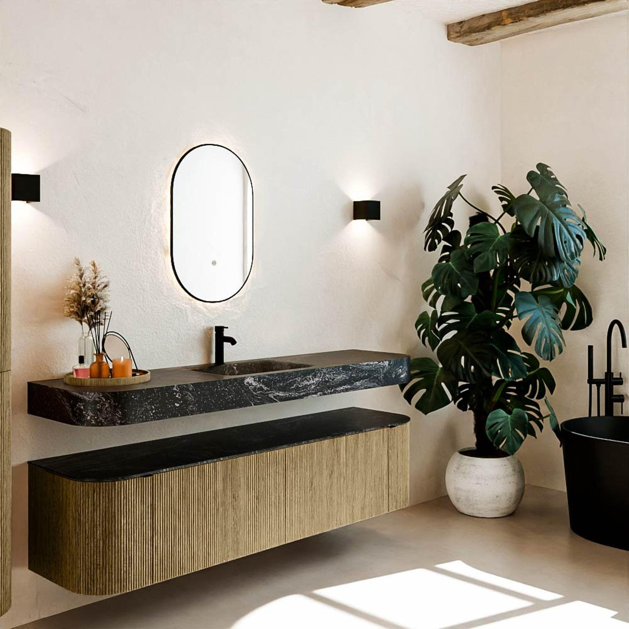 Natuurlijke materialen in warme tinten. De verticale ribbels brengen ritme en textuur in het ontwerp, terwijl het eikenhout zorgt voor een warme, ambachtelijke uitstraling. Kies uit 5 houttinten OAK, WALNUT, DUSK, SHADOW en RUBY zorgvuldig geselecteerde houtkleuren om zowel moderne als klassieke badkamers te verrijken.
