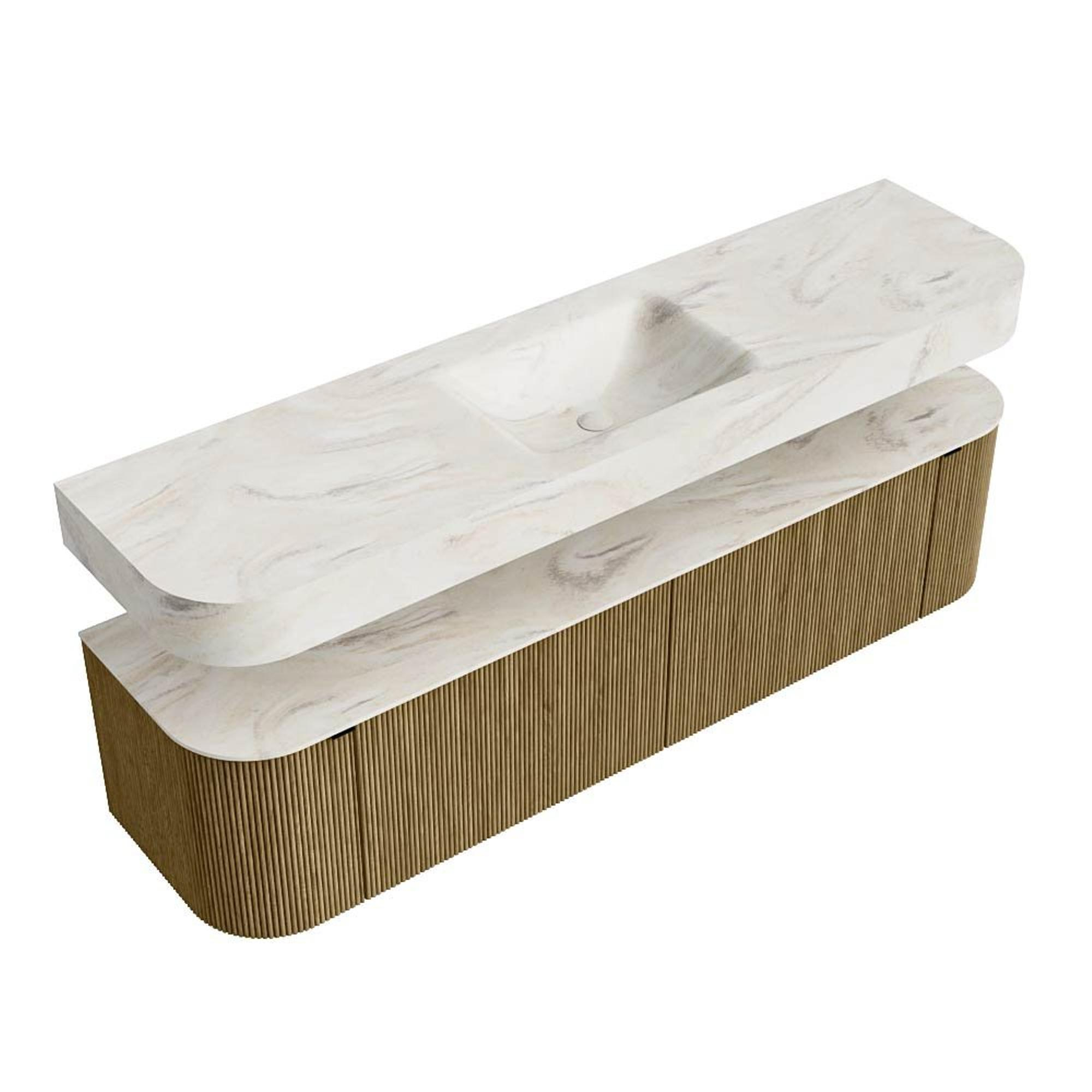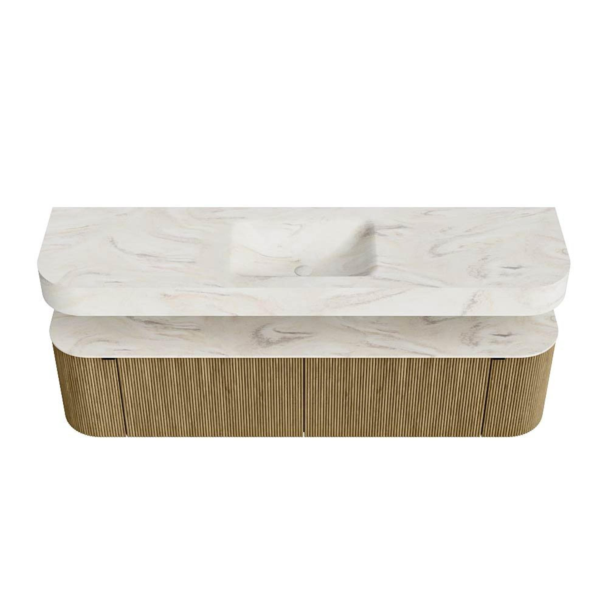 Boven het meubel zweeft een bijpassende, vrij hangende wastafel met afgeronde hoeken – perfect afgestemd op de vorm van de kast. De wastafel is uitgevoerd in Solid Surface en volgt subtiel de lijnen van het onderliggende meubel, waardoor een harmonieus geheel ontstaat. Het Solid Surface topblad vormt een sterke, onderhoudsvriendelijke basis en maakt de combinatie compleet.