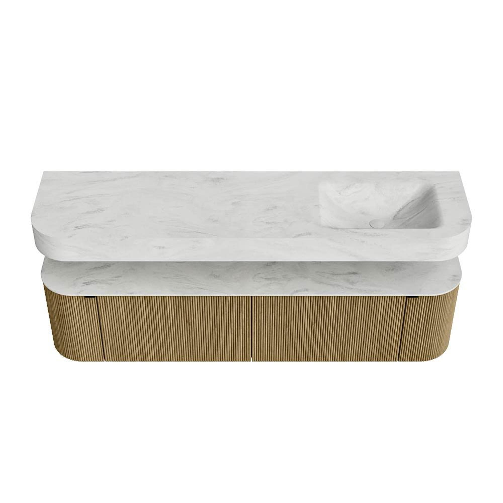 Boven het meubel zweeft een bijpassende, vrij hangende wastafel met afgeronde hoeken – perfect afgestemd op de vorm van de kast. De wastafel is uitgevoerd in Solid Surface en volgt subtiel de lijnen van het onderliggende meubel, waardoor een harmonieus geheel ontstaat. Het Solid Surface topblad vormt een sterke, onderhoudsvriendelijke basis en maakt de combinatie compleet.