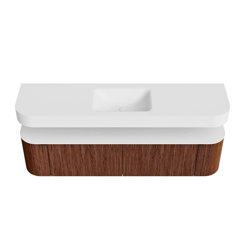 Boven het meubel zweeft een bijpassende, vrij hangende wastafel met afgeronde hoeken – perfect afgestemd op de vorm van de kast. De wastafel is uitgevoerd in Solid Surface en volgt subtiel de lijnen van het onderliggende meubel, waardoor een harmonieus geheel ontstaat. Het Solid Surface topblad vormt een sterke, onderhoudsvriendelijke basis en maakt de combinatie compleet.
