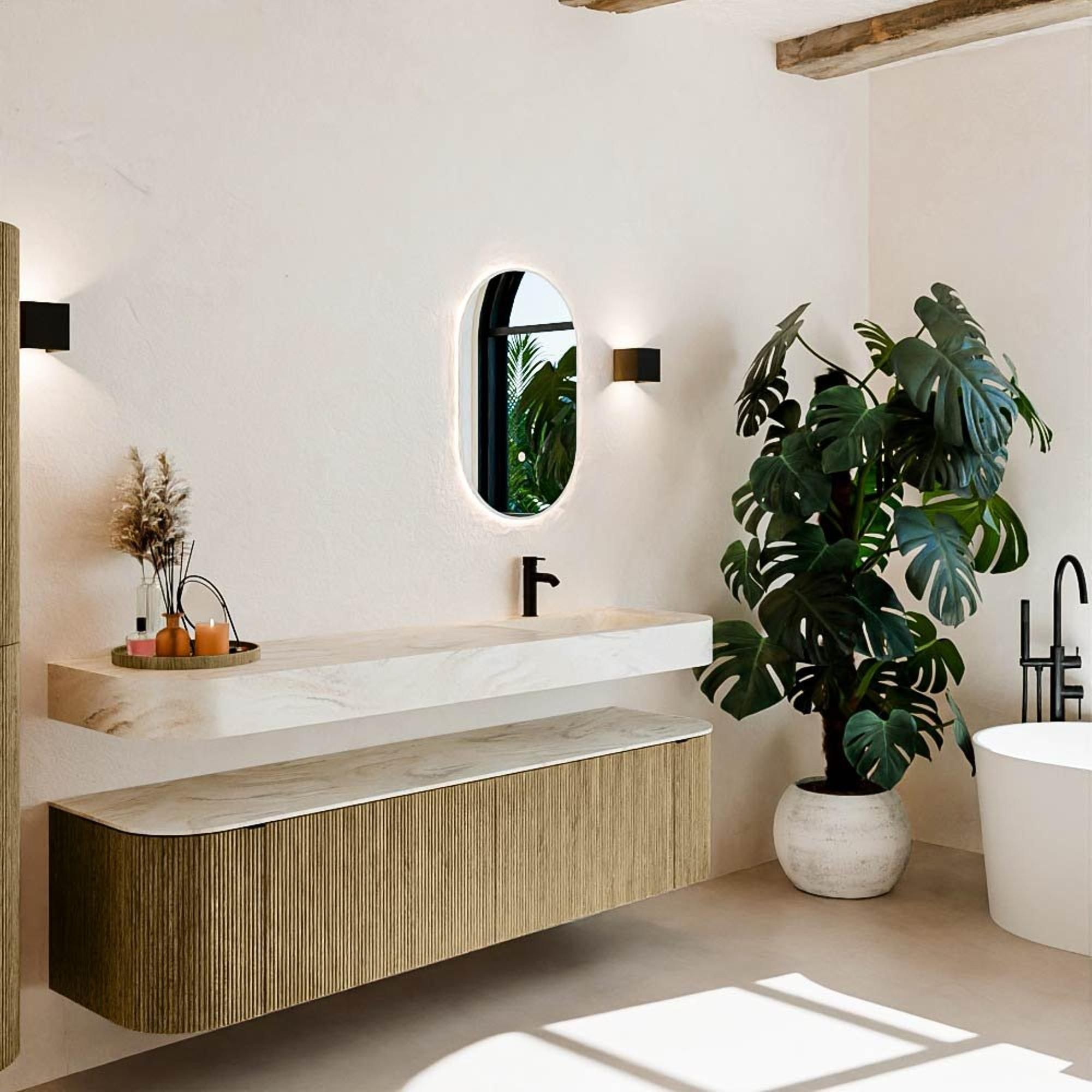 Natuurlijke materialen in warme tinten. De verticale ribbels brengen ritme en textuur in het ontwerp, terwijl het eikenhout zorgt voor een warme, ambachtelijke uitstraling. Kies uit 5 houttinten OAK, WALNUT, DUSK, SHADOW en RUBY zorgvuldig geselecteerde houtkleuren om zowel moderne als klassieke badkamers te verrijken.