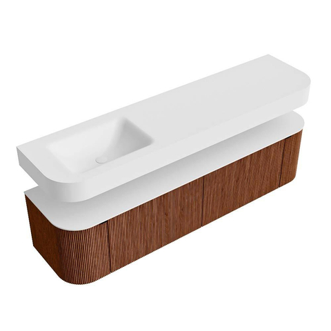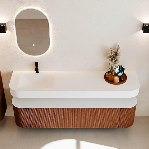 Boven het meubel zweeft een bijpassende, vrij hangende wastafel met afgeronde hoeken – perfect afgestemd op de vorm van de kast. De wastafel is uitgevoerd in Solid Surface en volgt subtiel de lijnen van het onderliggende meubel, waardoor een harmonieus geheel ontstaat. Het Solid Surface topblad vormt een sterke, onderhoudsvriendelijke basis en maakt de combinatie compleet.