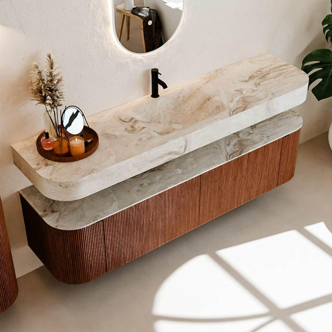 Boven het meubel zweeft een bijpassende, vrij hangende wastafel met afgeronde hoeken – perfect afgestemd op de vorm van de kast. De wastafel is uitgevoerd in Solid Surface en volgt subtiel de lijnen van het onderliggende meubel, waardoor een harmonieus geheel ontstaat. Het Solid Surface topblad vormt een sterke, onderhoudsvriendelijke basis en maakt de combinatie compleet.