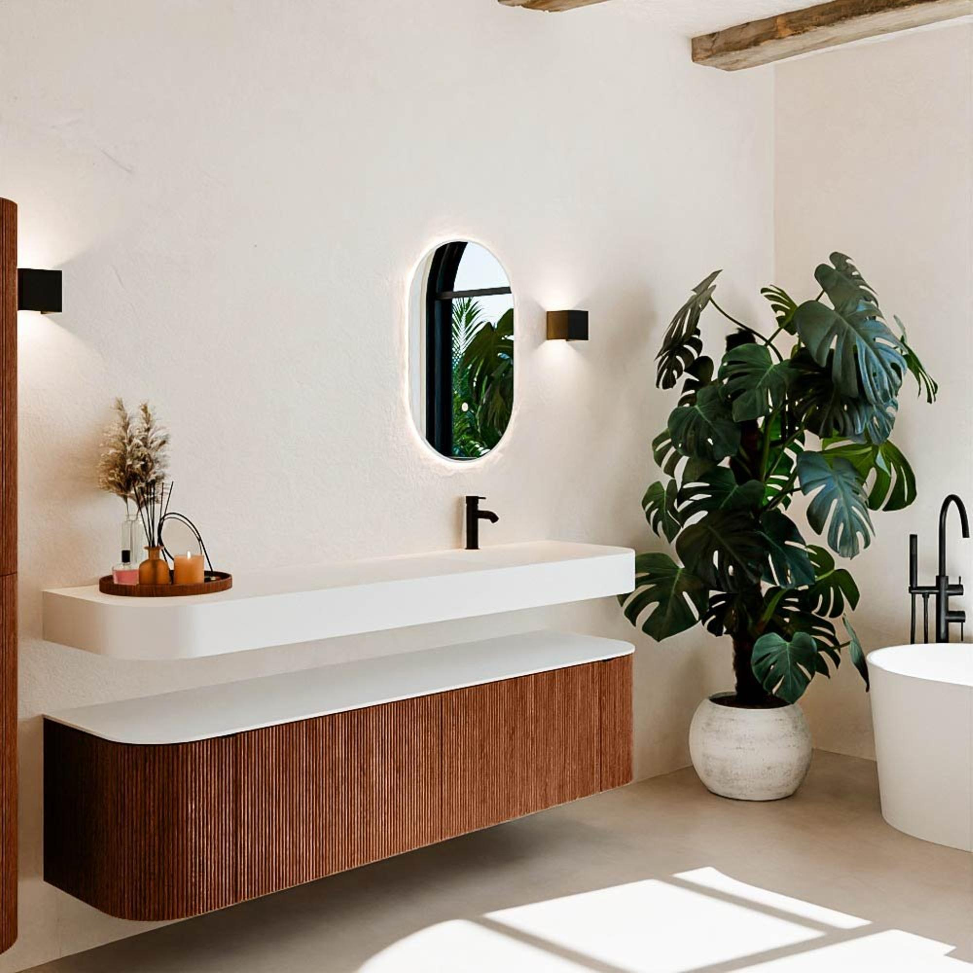 Natuurlijke materialen in warme tinten. De verticale ribbels brengen ritme en textuur in het ontwerp, terwijl het eikenhout zorgt voor een warme, ambachtelijke uitstraling. Kies uit 5 houttinten OAK, WALNUT, DUSK, SHADOW en RUBY zorgvuldig geselecteerde houtkleuren om zowel moderne als klassieke badkamers te verrijken.